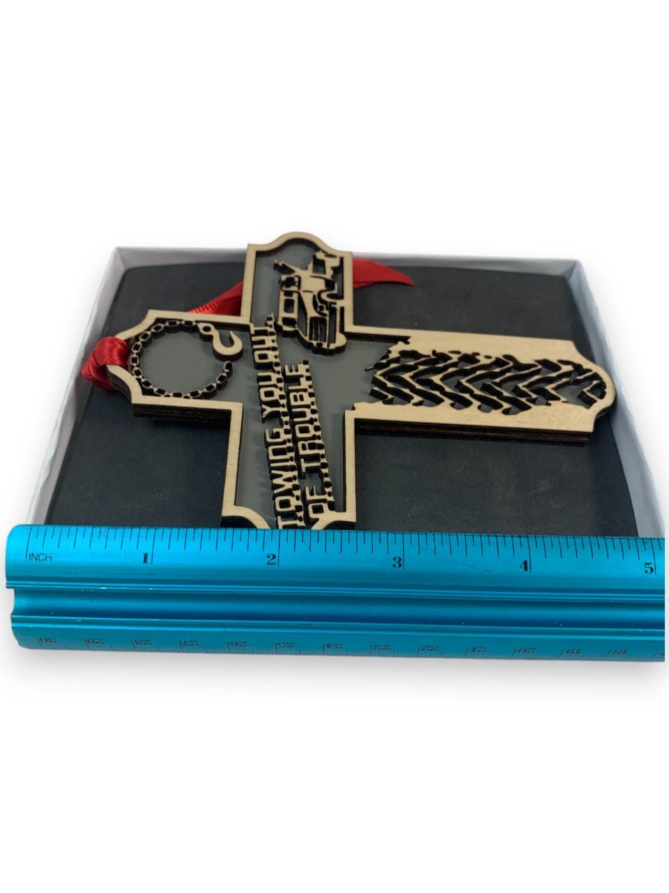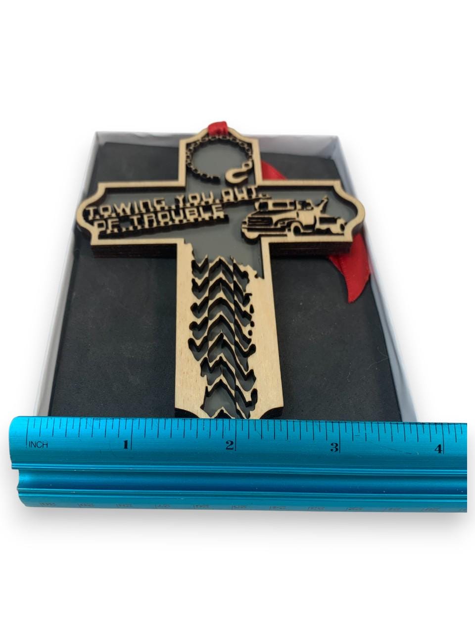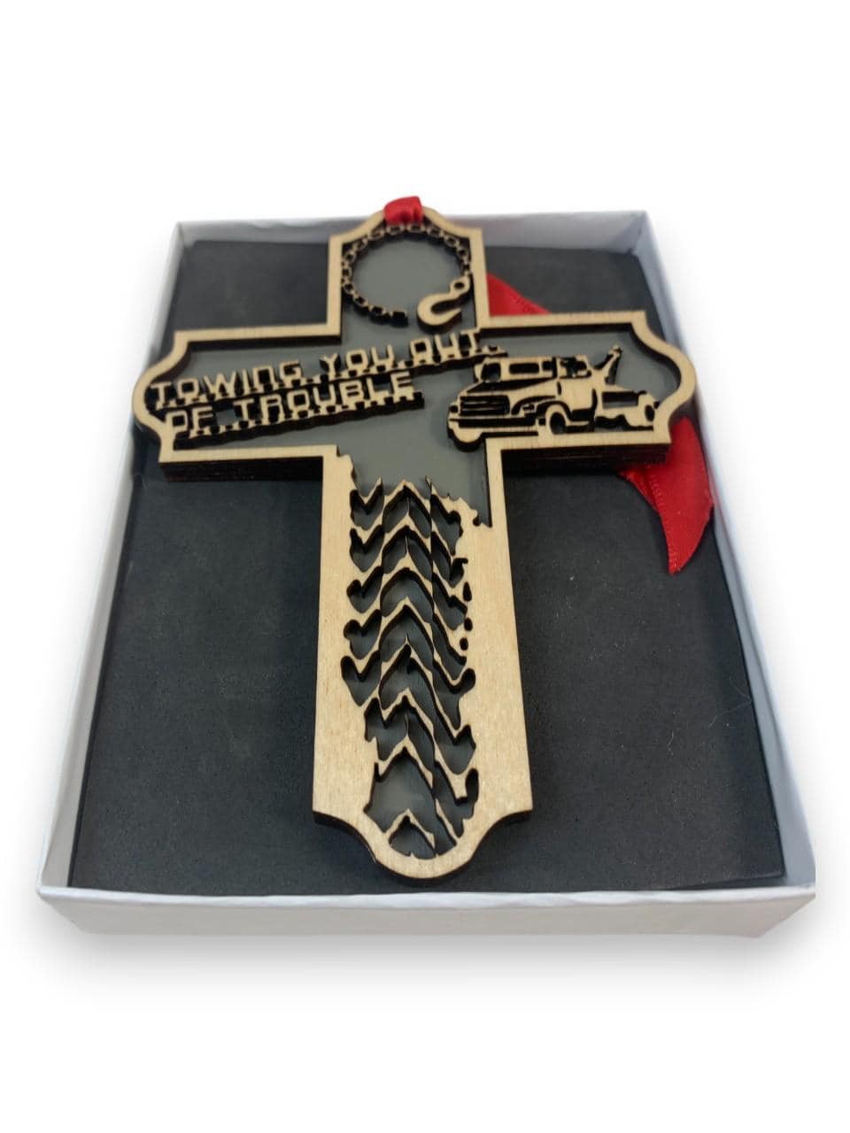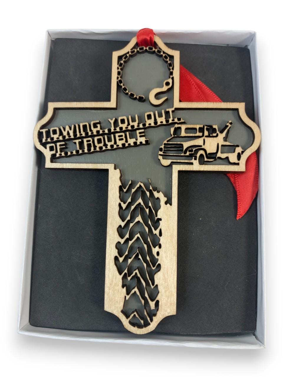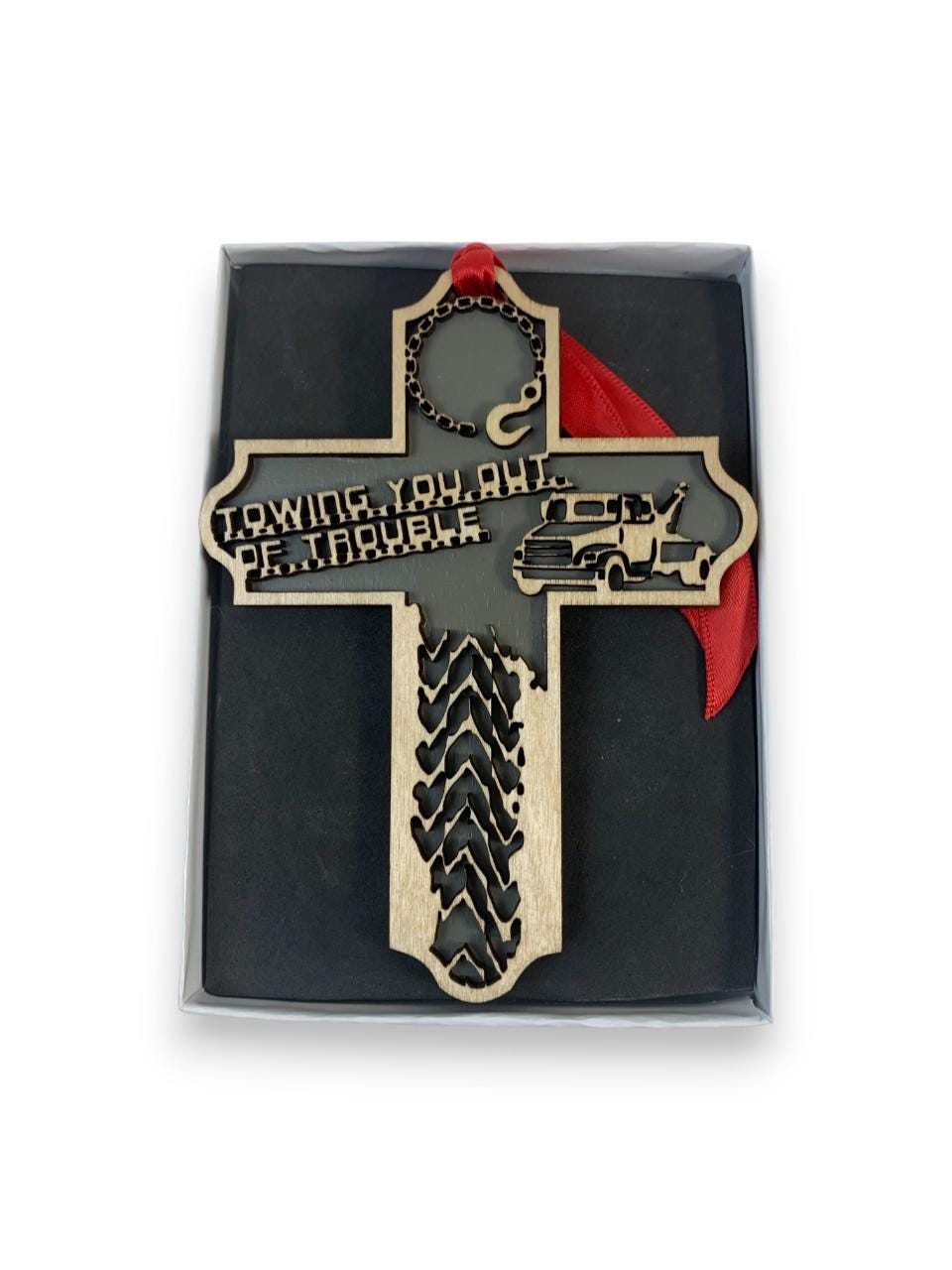 This Tow Truck cross ornament features the mud / snow tire track at the bottom, the left side features a tow chain banner that says " Towing you Out Of Trouble ", right side features a Tow Truck and at the top is a tow chain and hook