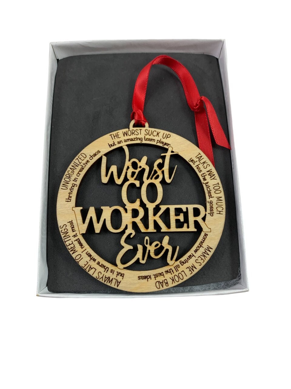 This "Worst Coworker Ever" Christmas ornament is a perfect gag gift for your coworker or colleague. It's outlined with snarky reasons why they are the worst ...but also nice reasons why they are the best in smaller print. It makes a great gift or stocking stuffer