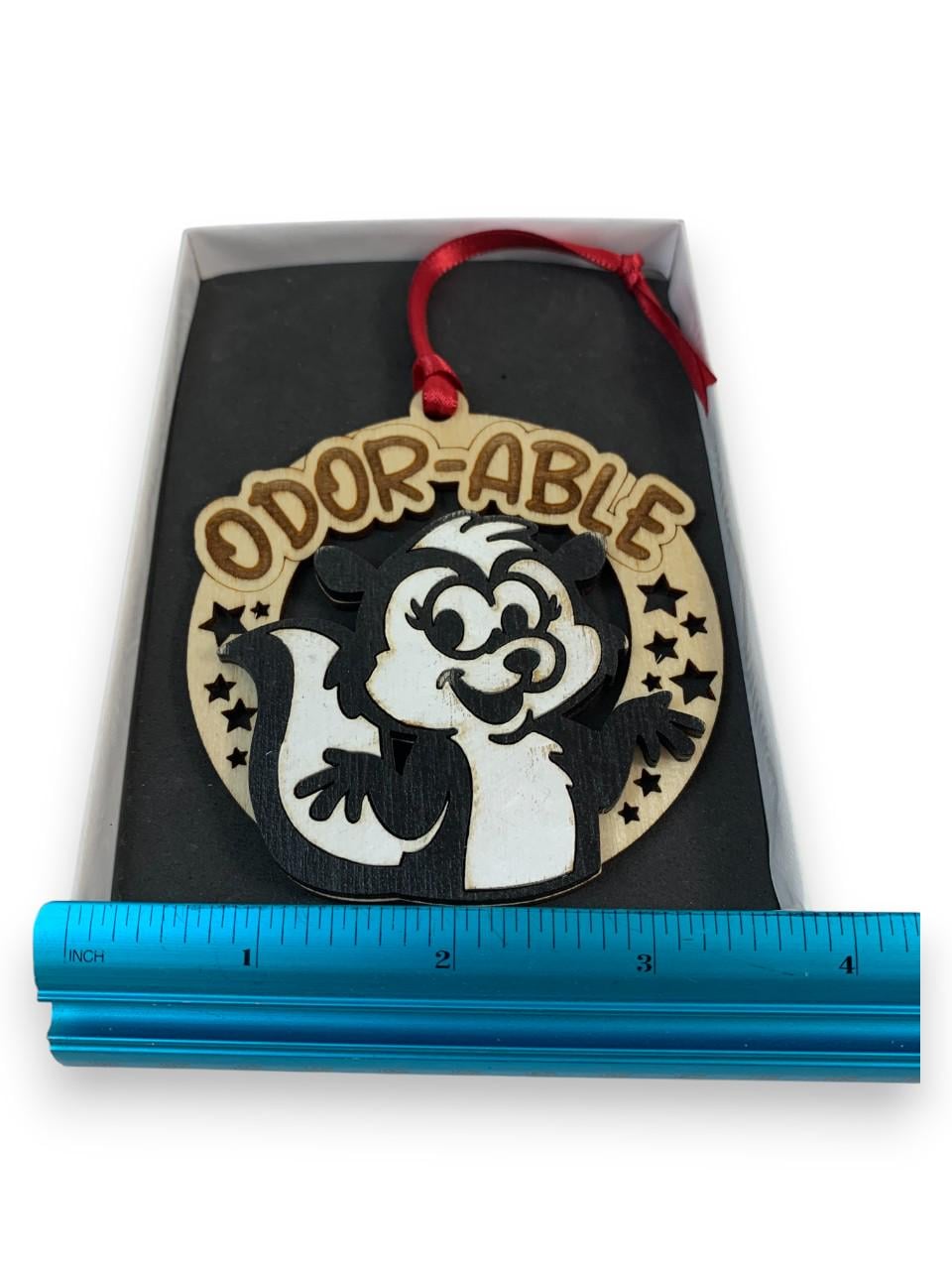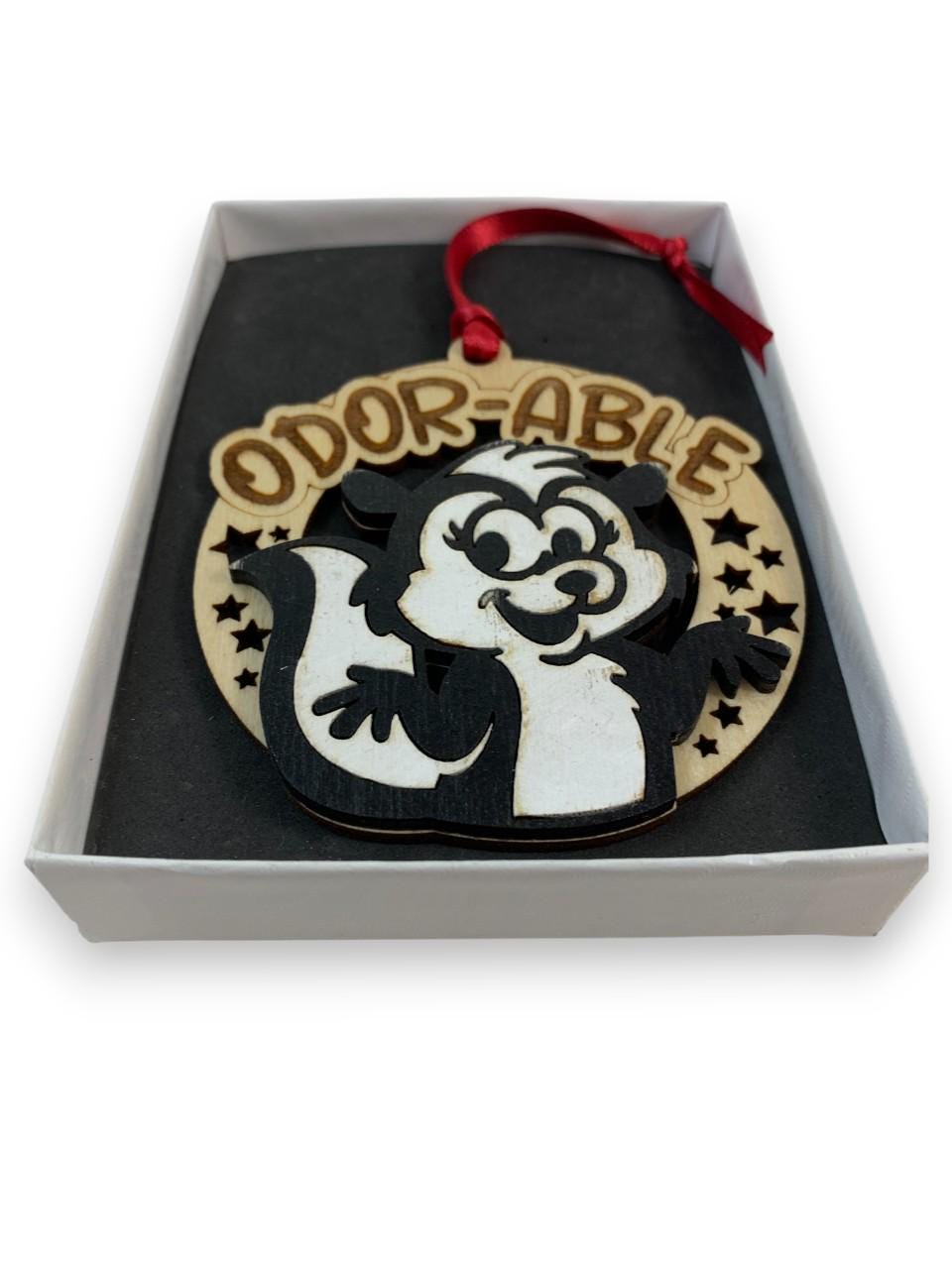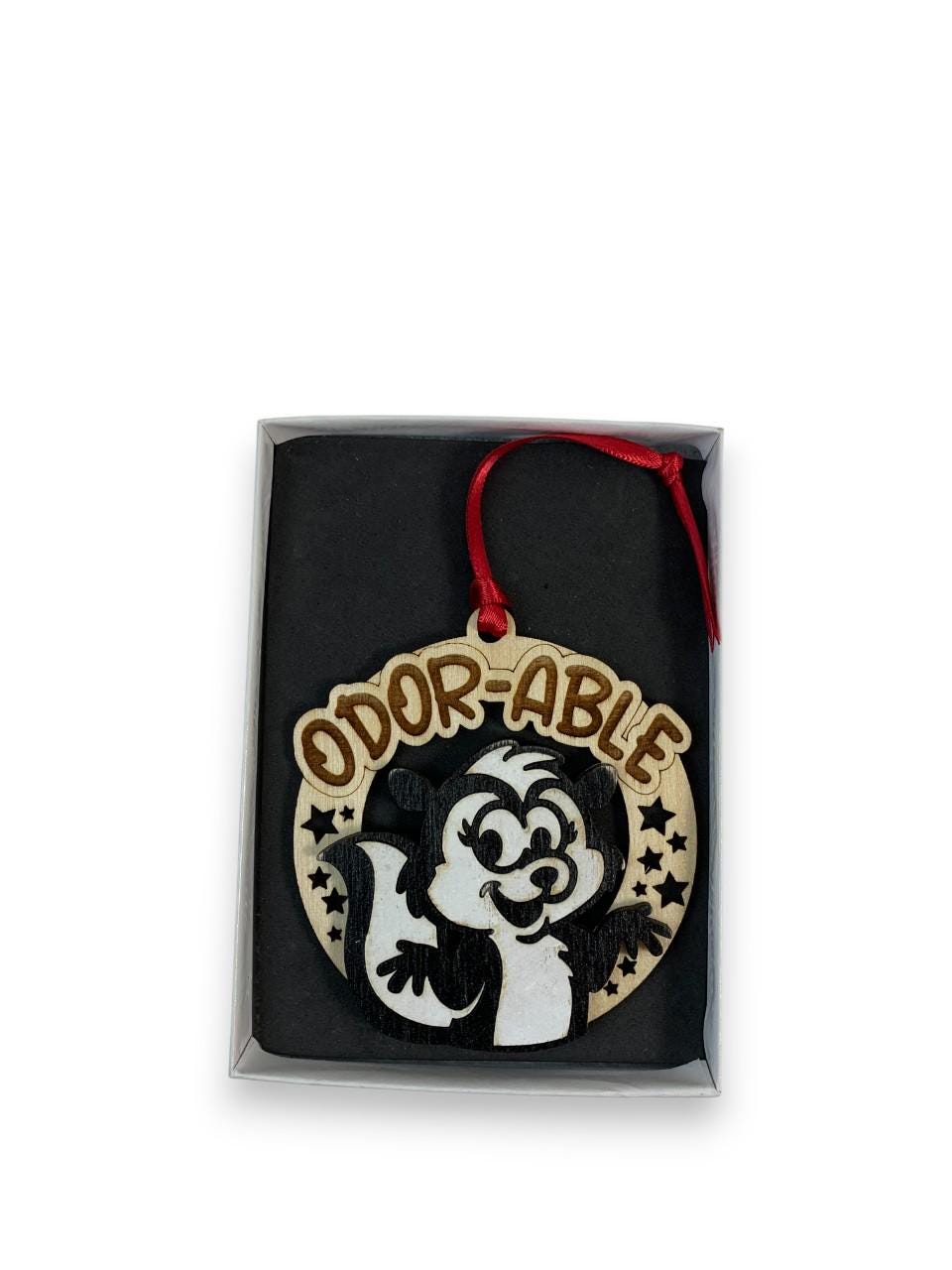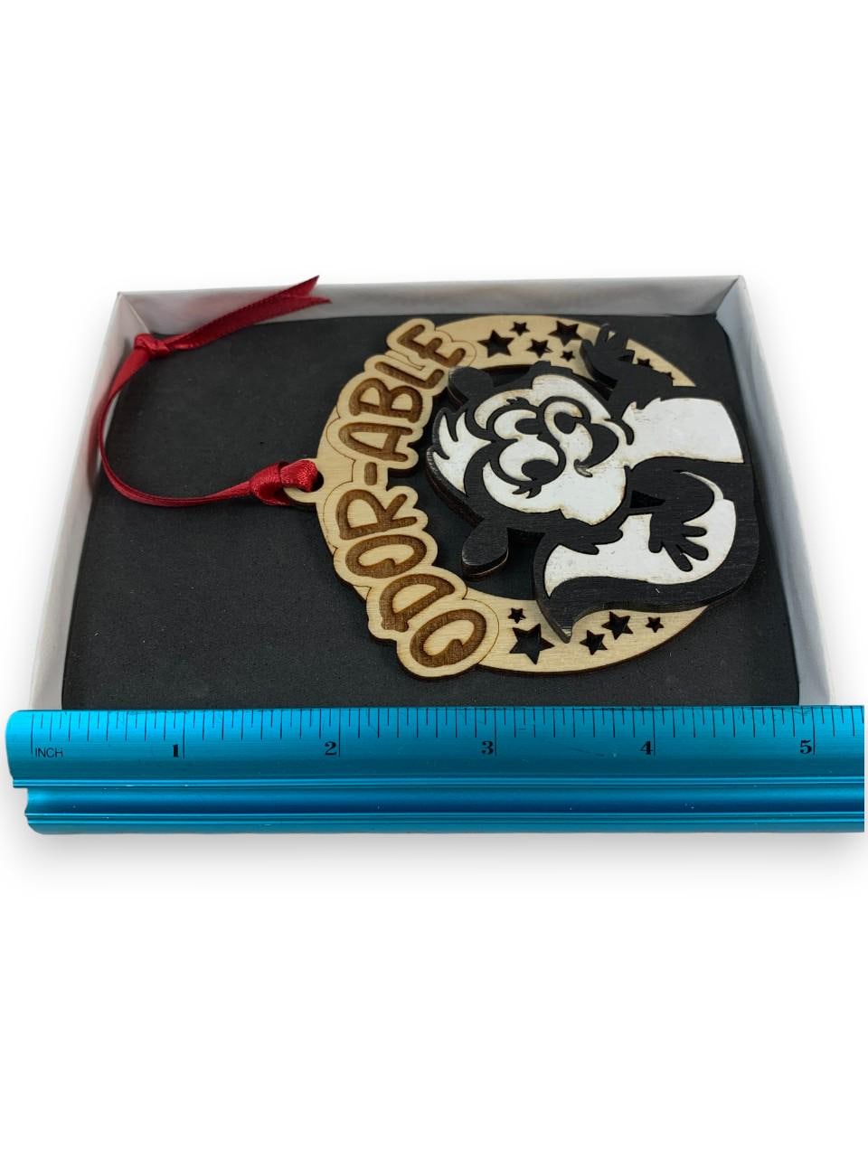 This Funny Skunk Gag Gift Christmas ornament was laser engraved and cut from Birch wood. This was finished with acrylic paint and top coated with semi gloss Lacquer. A various color fabric ribbon was attached for ease of displaying this on your Christmas tree.
