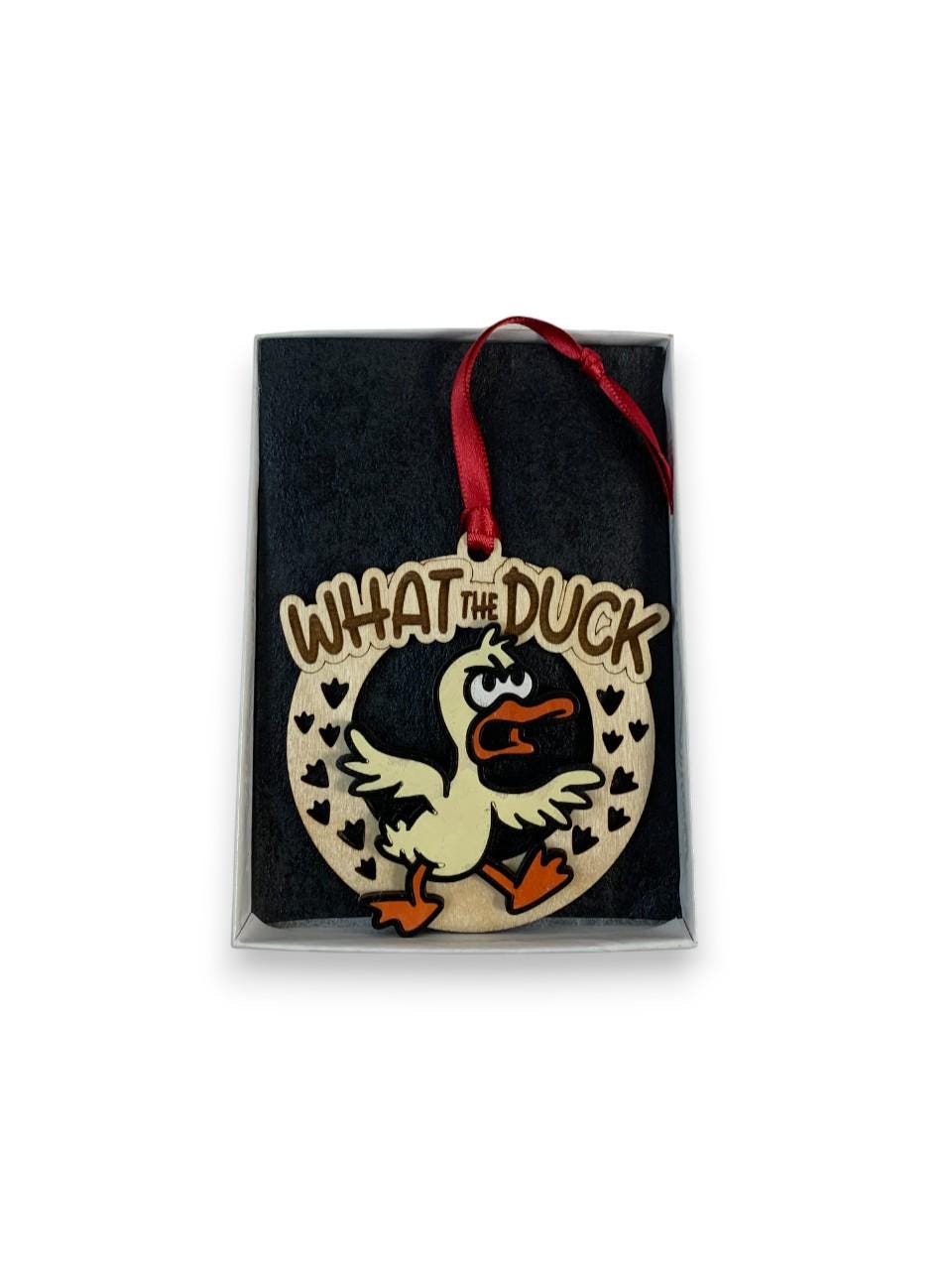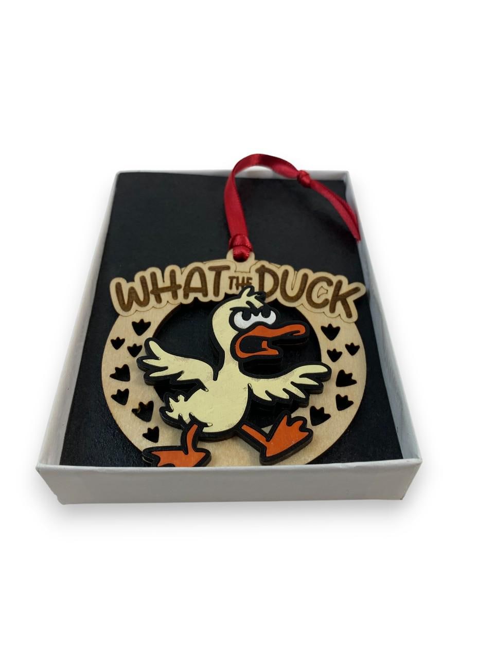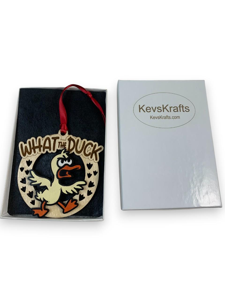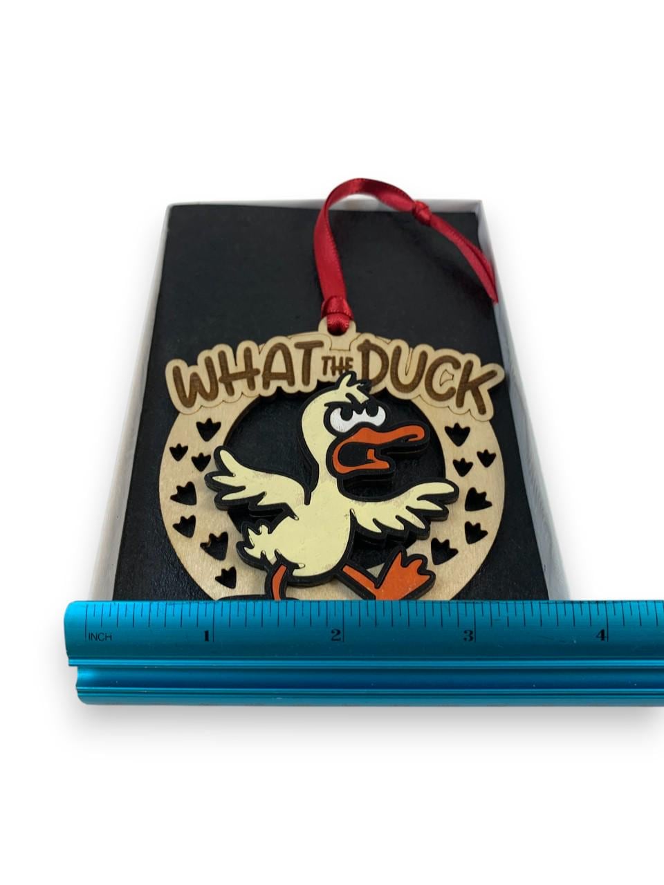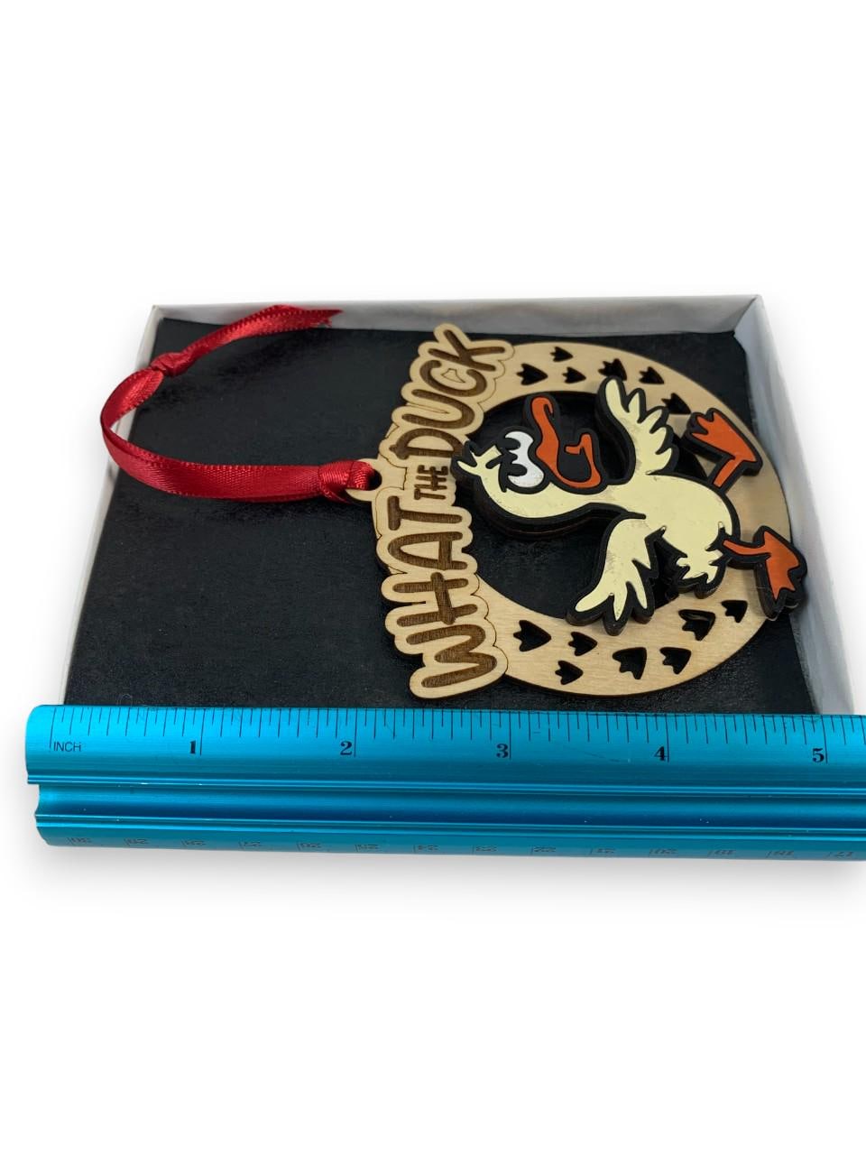 This Funny Duck Gag Gift Christmas ornament "What The Duck" was laser engraved and cut from Birch wood. This was finished with acrylic paint and top coated with semi gloss Lacquer. A various color fabric ribbon was attached for ease of displaying this on your Christmas tree.
