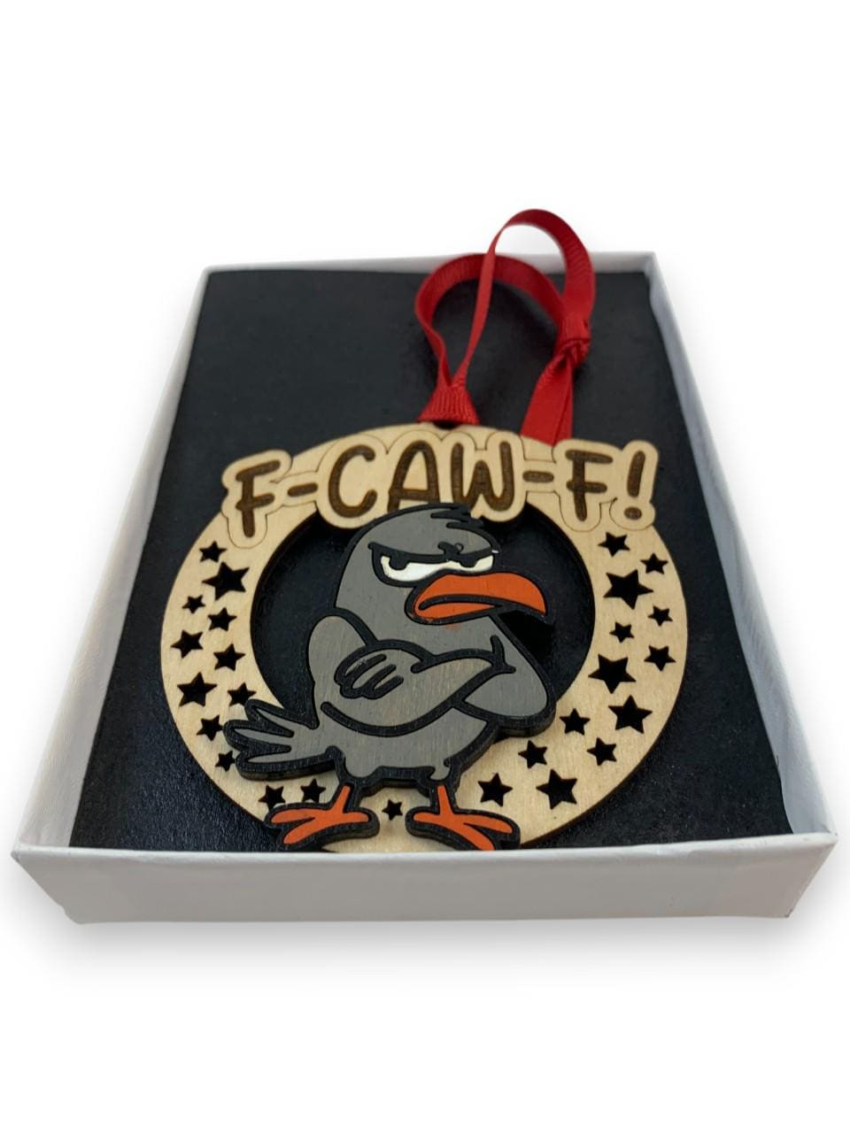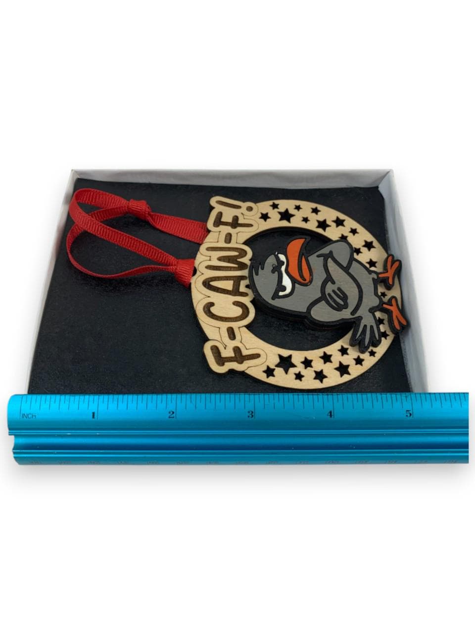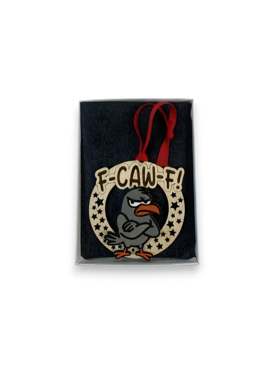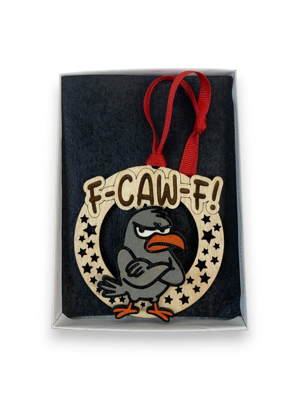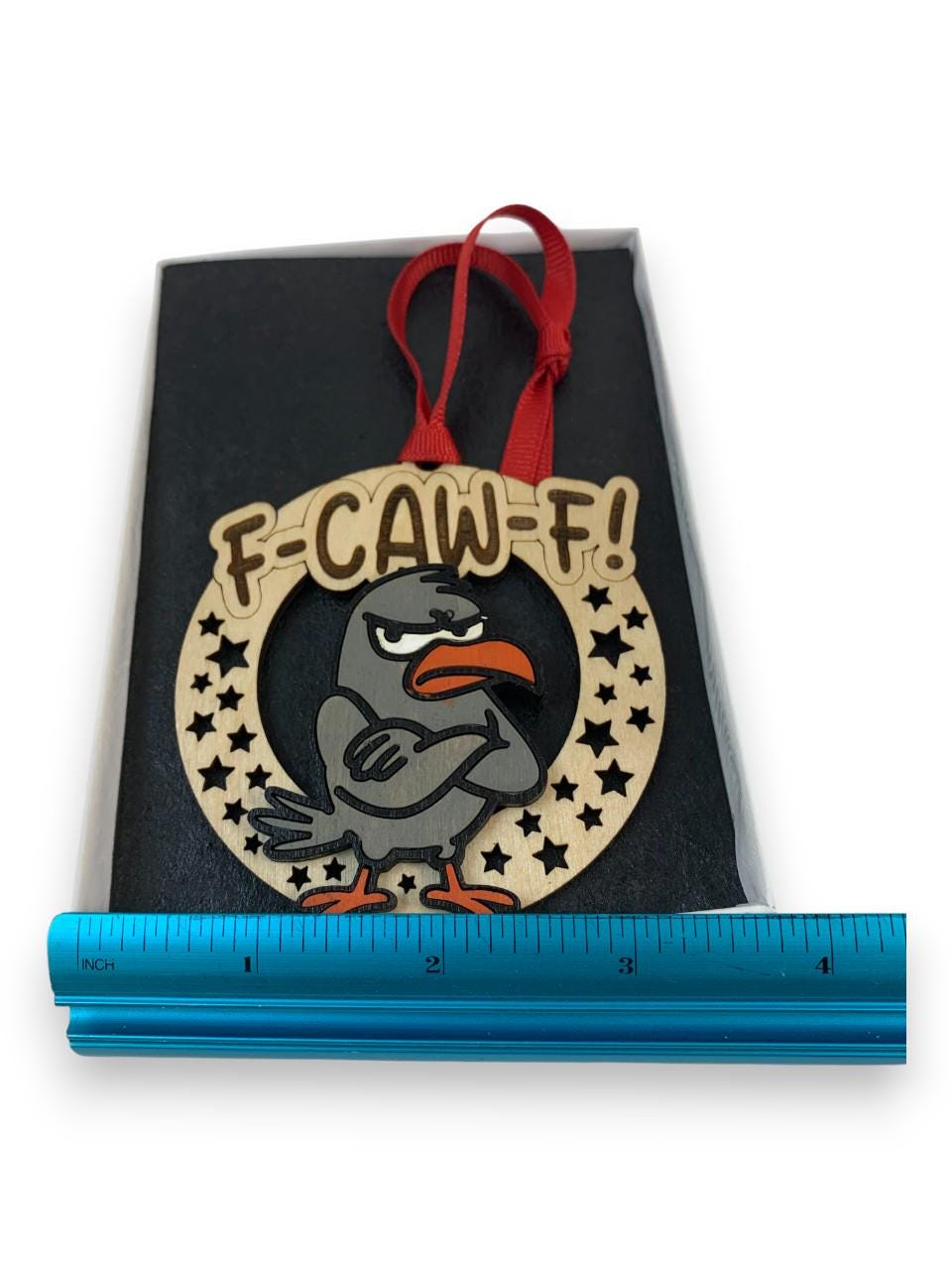 This Funny Crow "F-Caw-F" Gag Gift Christmas ornament was laser engraved and cut from Birch wood. This was finished with acrylic paint and top coated with semi gloss Lacquer. A various color fabric ribbon was attached for ease of displaying this on your Christmas tree.