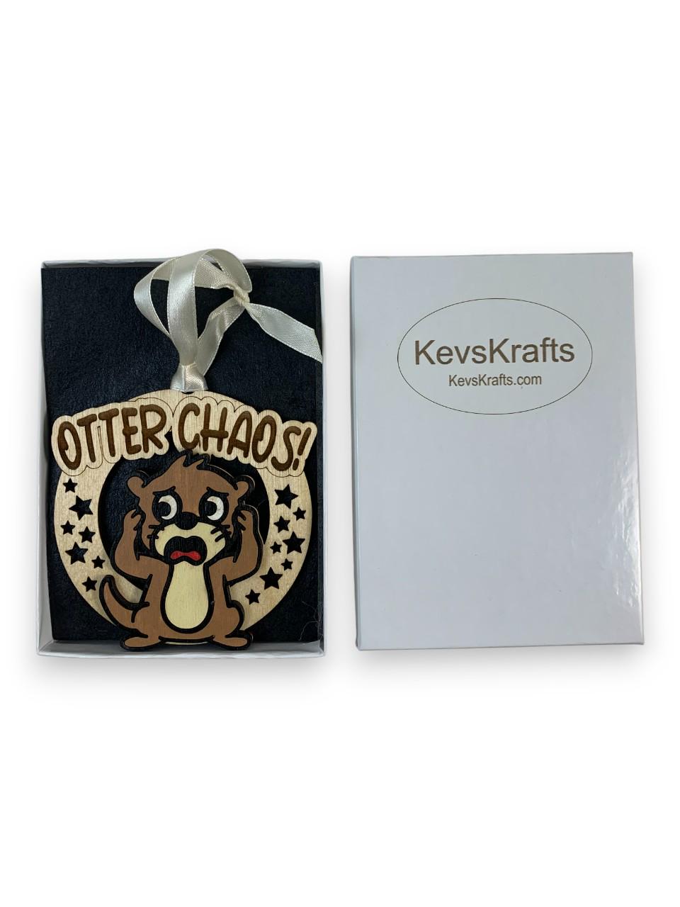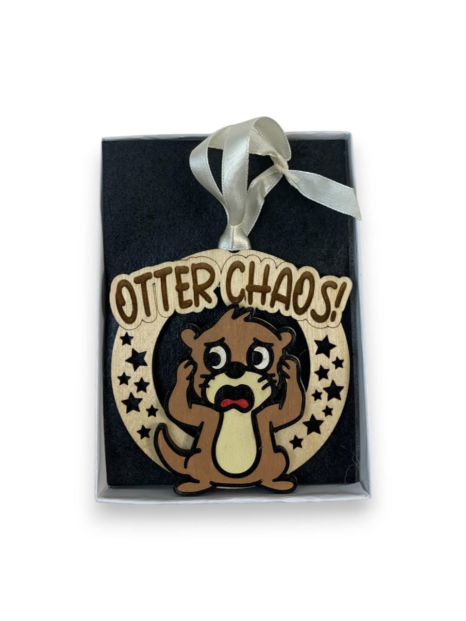 This Funny Otter "Otter Chaos" Gag Gift Christmas ornament was laser engraved and cut from Birch wood. This was finished with acrylic paint and top coated with semi gloss Lacquer. A various color fabric ribbon was attached for ease of displaying this on your Christmas tree.