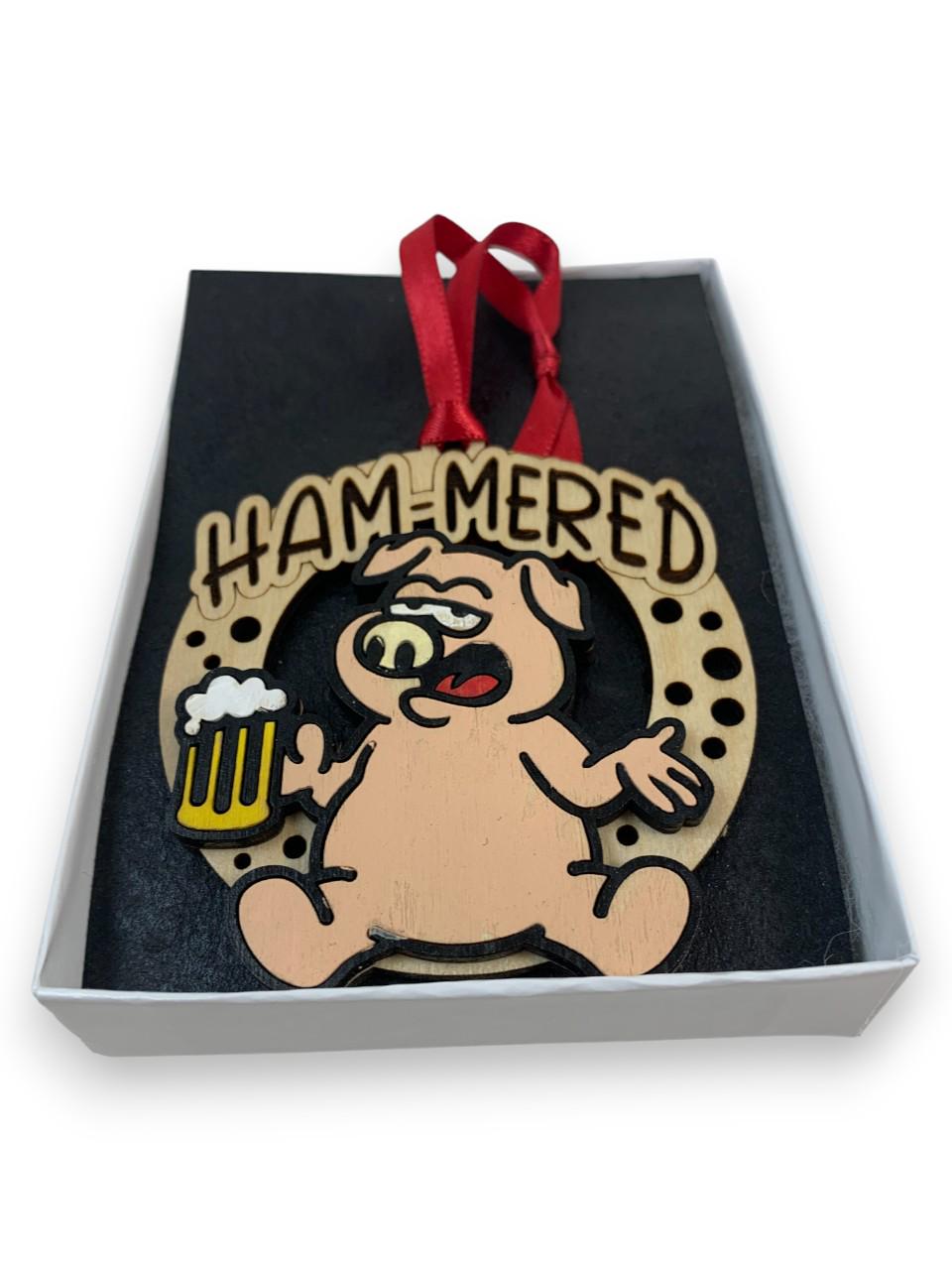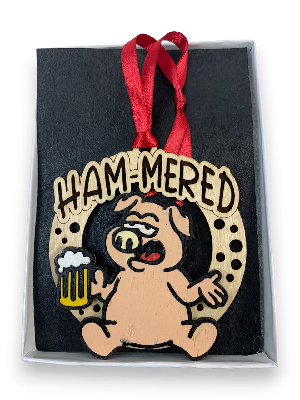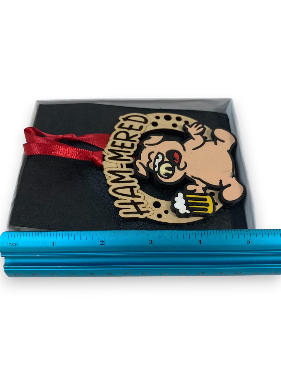 This Funny Pig "Ham-Merd" Gag Gift Christmas ornament was laser engraved and cut from Birch wood. This was finished with acrylic paint and top coated with semi gloss Lacquer. A various color fabric ribbon was attached for ease of displaying this on your Christmas tree.
