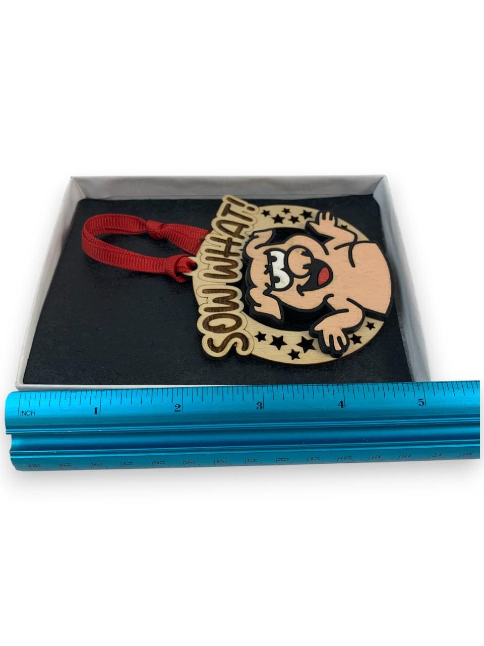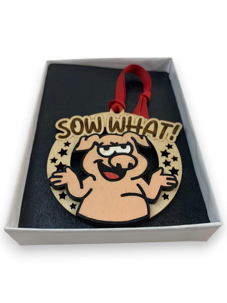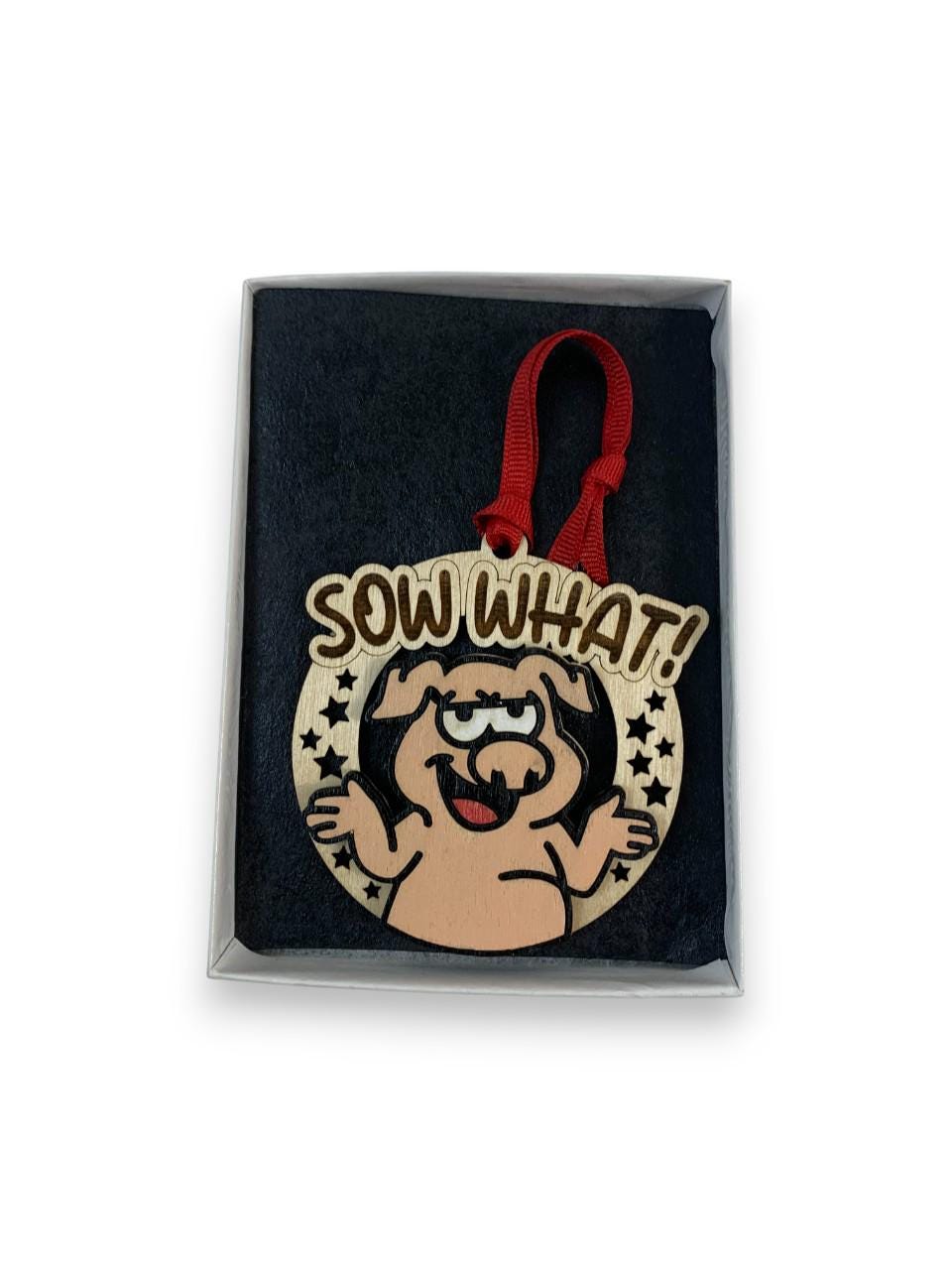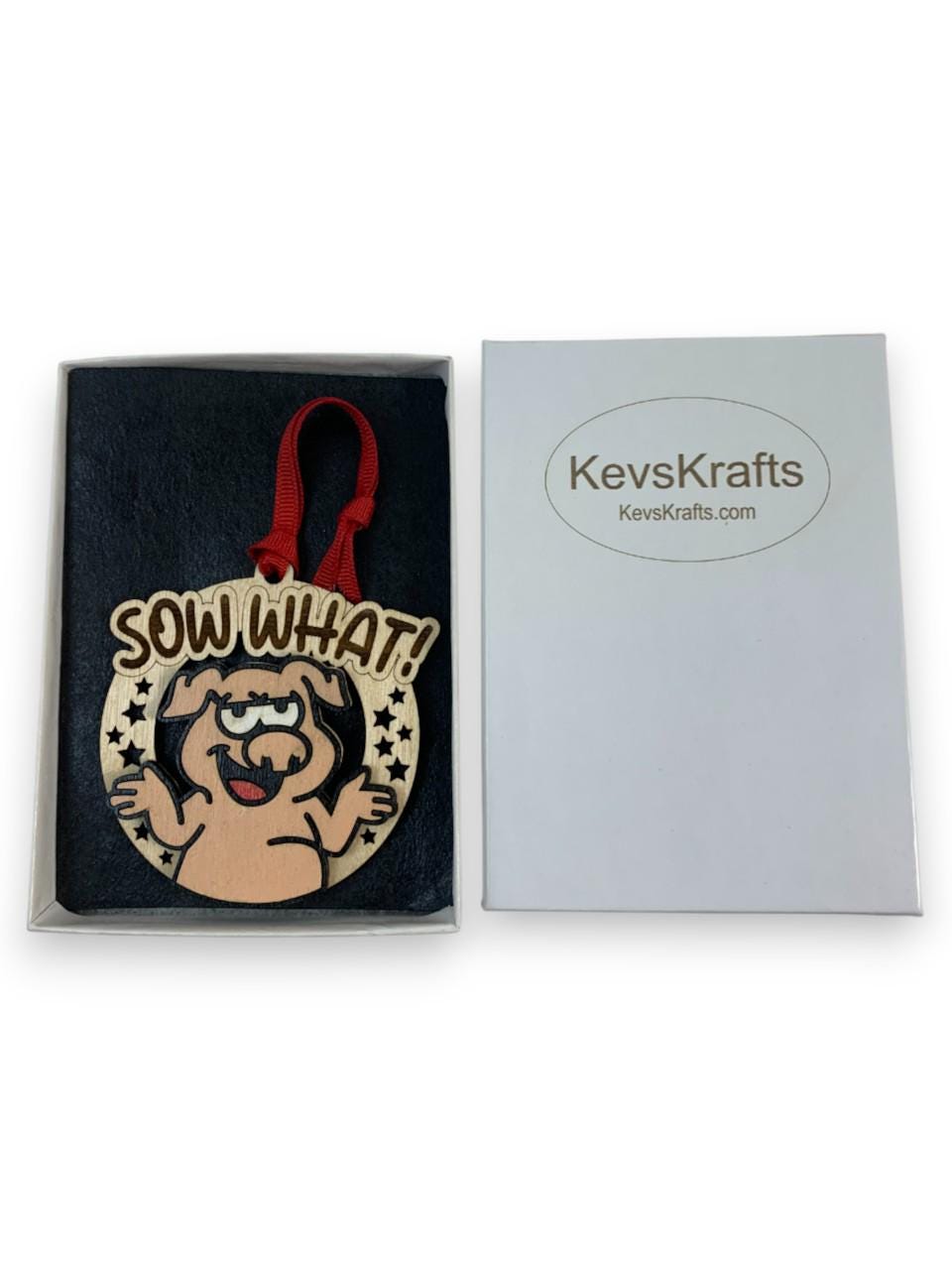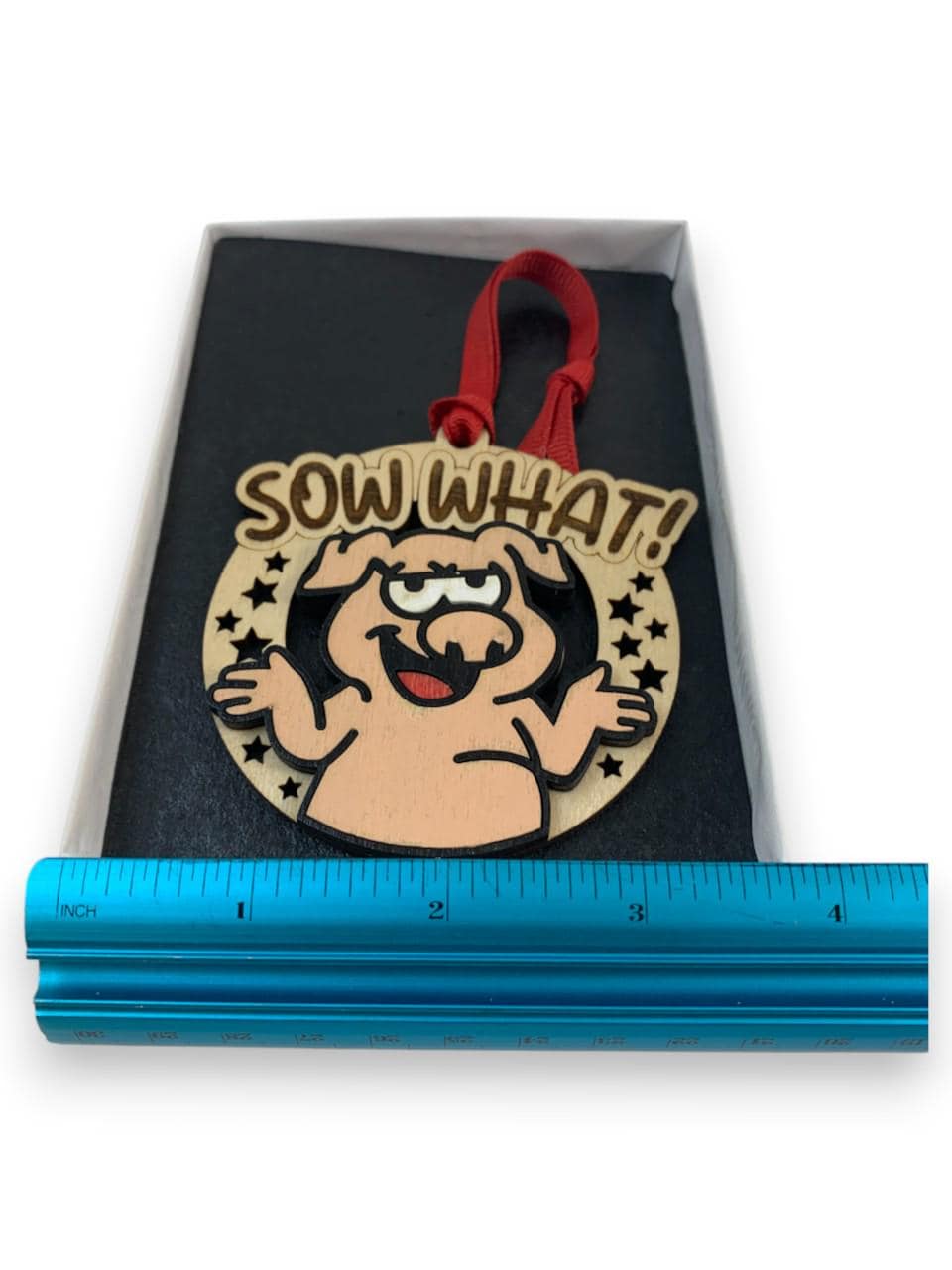 This Funny Pig "Sow What" Gag Gift Christmas ornament was laser engraved and cut from Birch wood. This was finished with acrylic paint and top coated with semi gloss Lacquer. A various color fabric ribbon was attached for ease of displaying this on your Christmas tree.