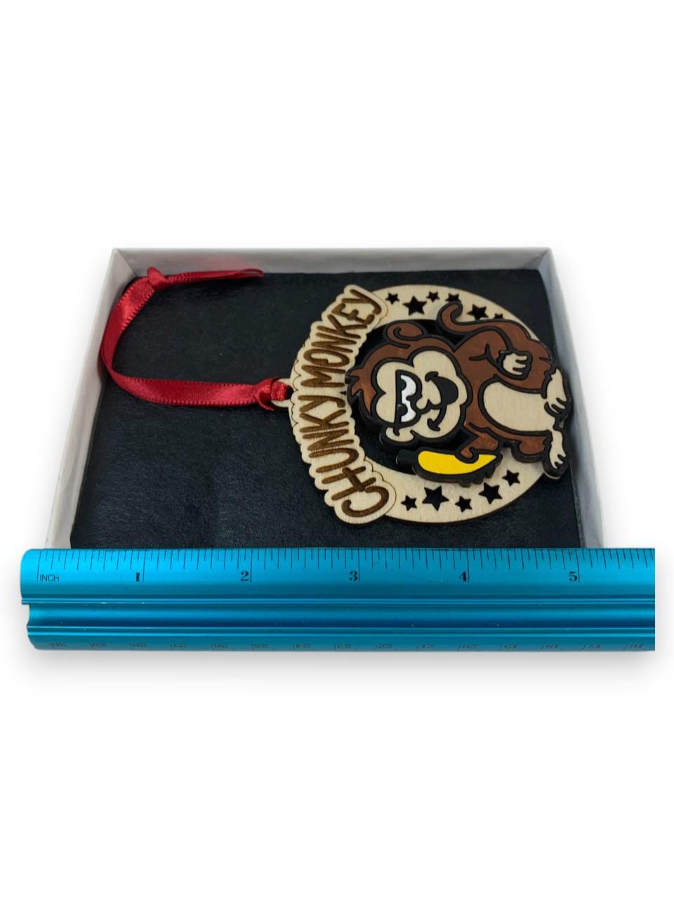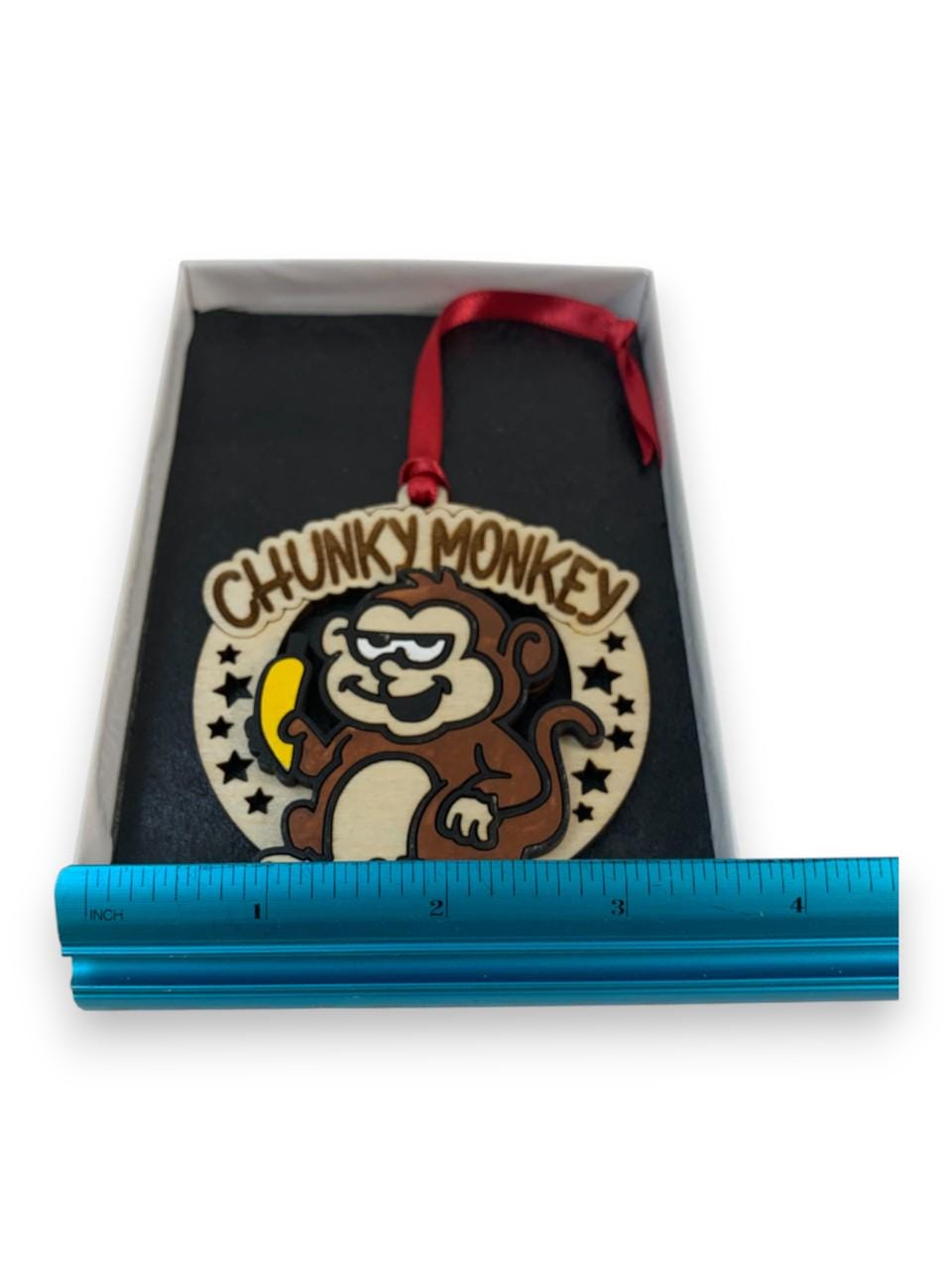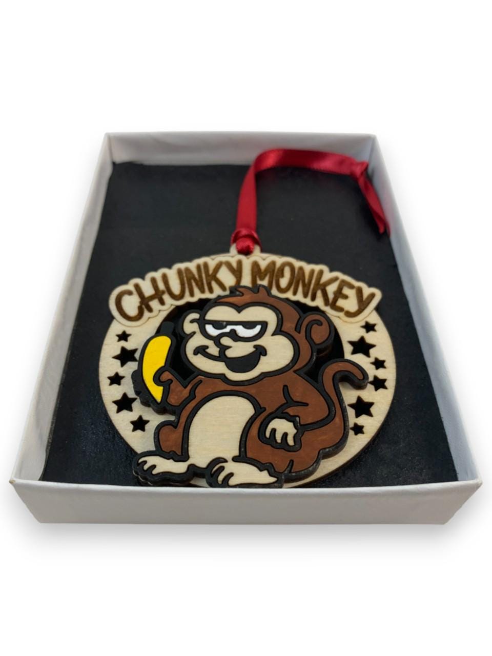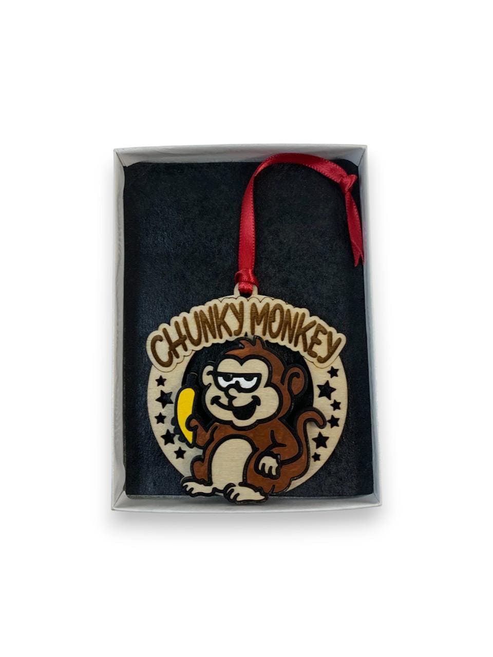 This Funny Monkey "Chunky Monkey" Gag Gift Christmas ornament was laser engraved and cut from Birch wood. This was finished with acrylic paint and top coated with semi gloss Lacquer. A various color fabric ribbon was attached for ease of displaying this on your Christmas tree.