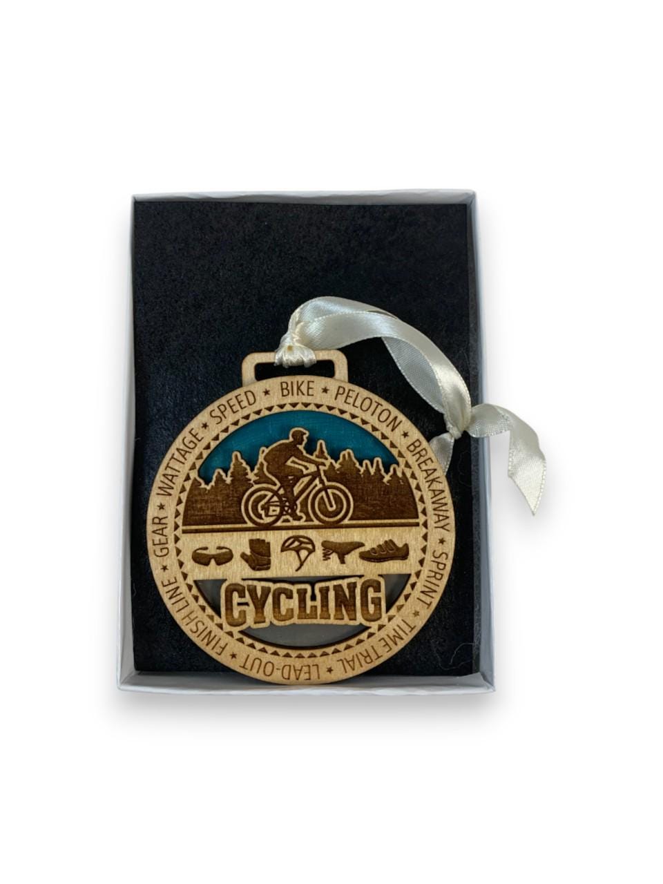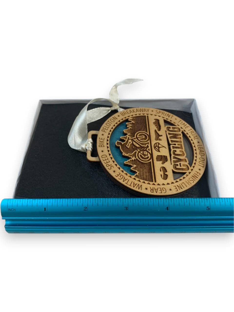 *HANDCRAFTED DESIGN: Beautiful wooden cycling-themed ornament featuring laser-etched mountain biking scene and cycling equipment icons with blue accent background