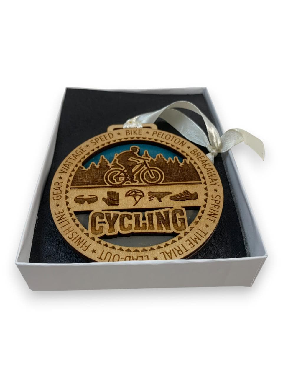 Celebrate the spirit of cycling with this beautifully crafted wooden ornament that captures the essence of the sport. This 3-inch round medallion-style decoration features intricate laser-etched details including a cyclist silhouette against a mountain backdrop, complemented by a striking blue accent. The design showcases essential cycling gear icons including sunglasses, gloves, helmet, seat, and shoes, making it perfect for any cycling enthusiast. The ornament comes with an elegant white ribbon for hanging and is presented in a sleek white gift box. Words like 'Speed,' 'Bike,' 'Peloton,' 'Breakaway,' and 'Sprint' encircle the design, celebrating various aspects of cycling culture. This detailed wooden ornament serves as both a decorative piece and a tribute to the cycling lifestyle, making it an ideal gift for bicycle enthusiasts, competitive cyclists, or anyone who appreciates the sport. The sturdy construction and careful craftsmanship ensure this piece will be a lasting reminder of cycling passion for years to come.