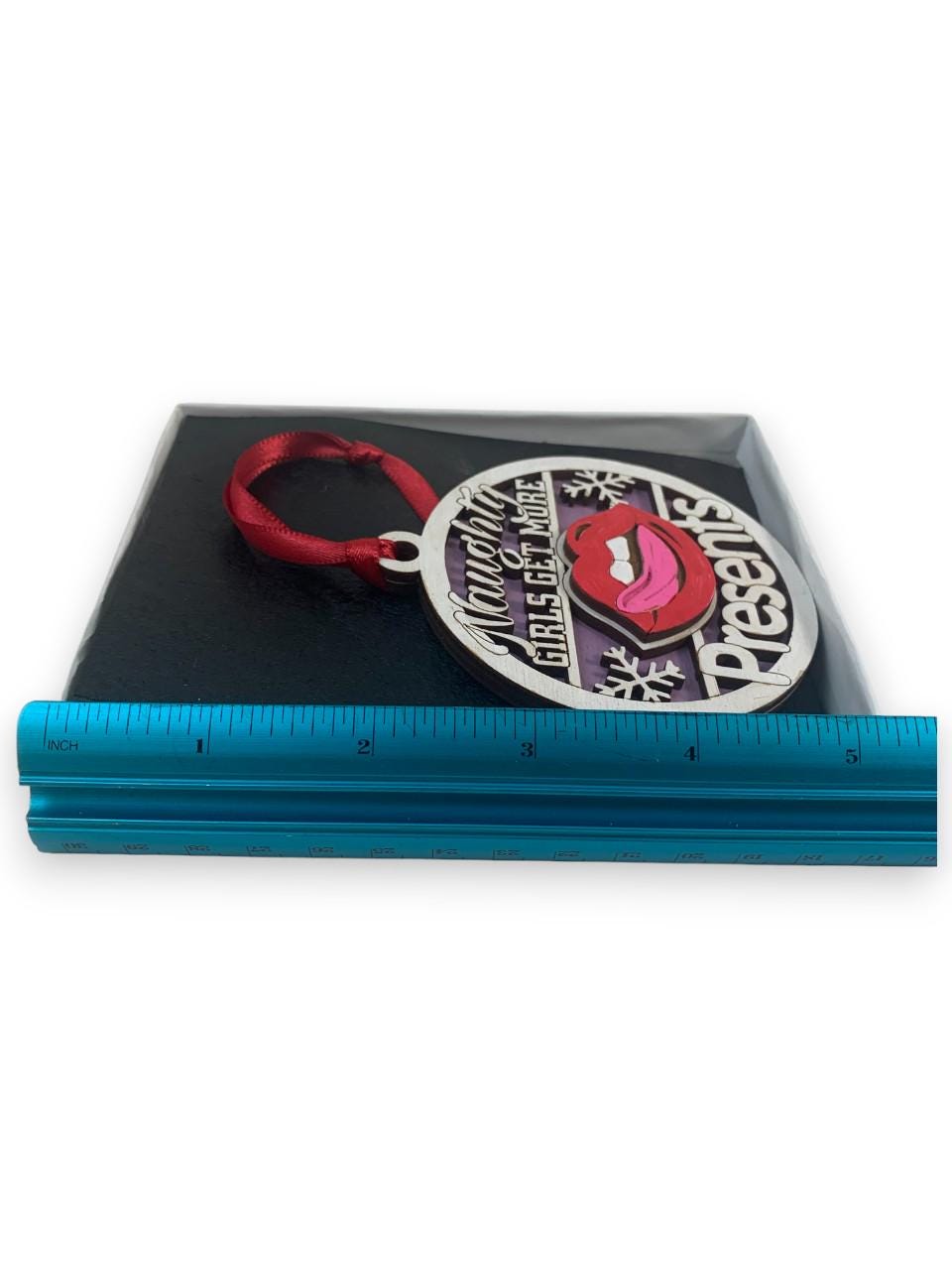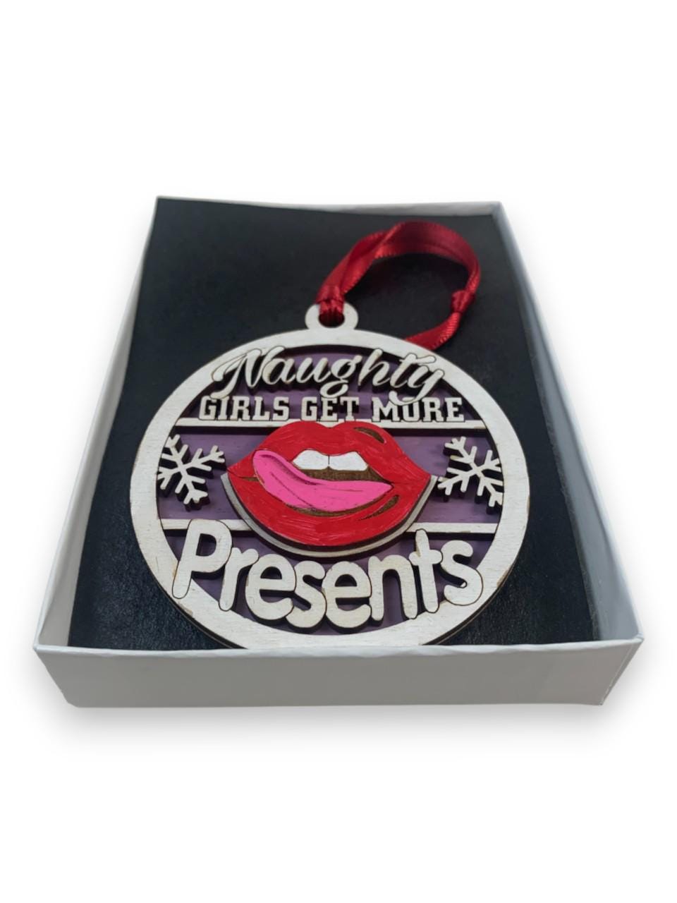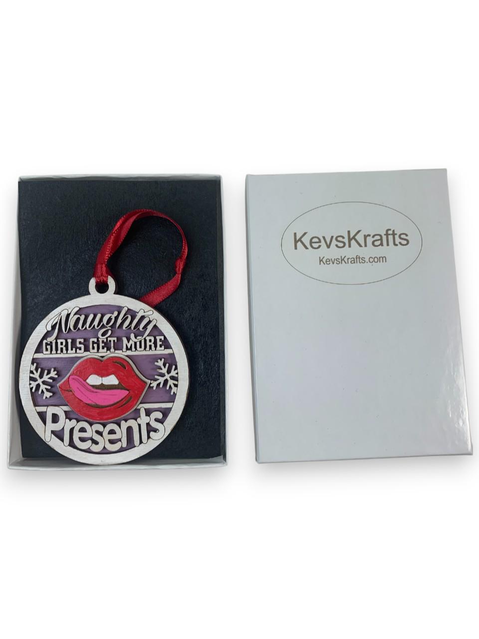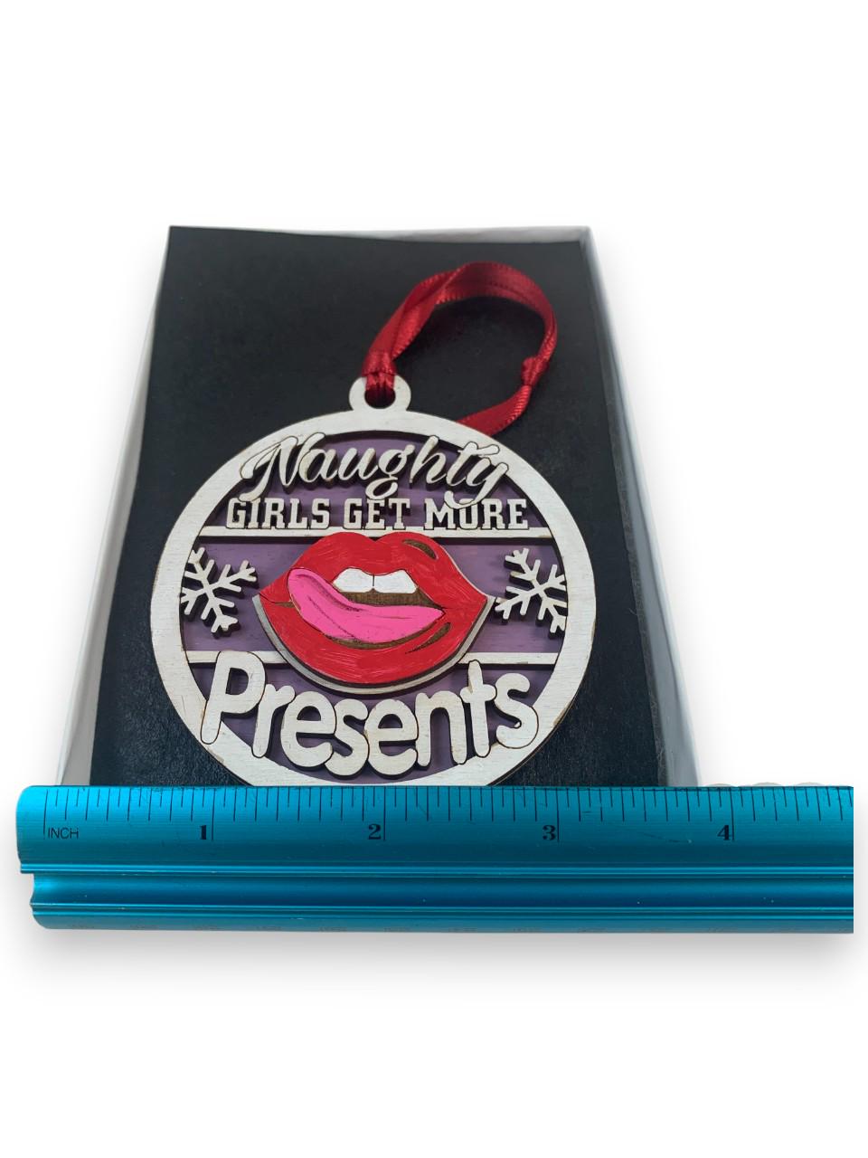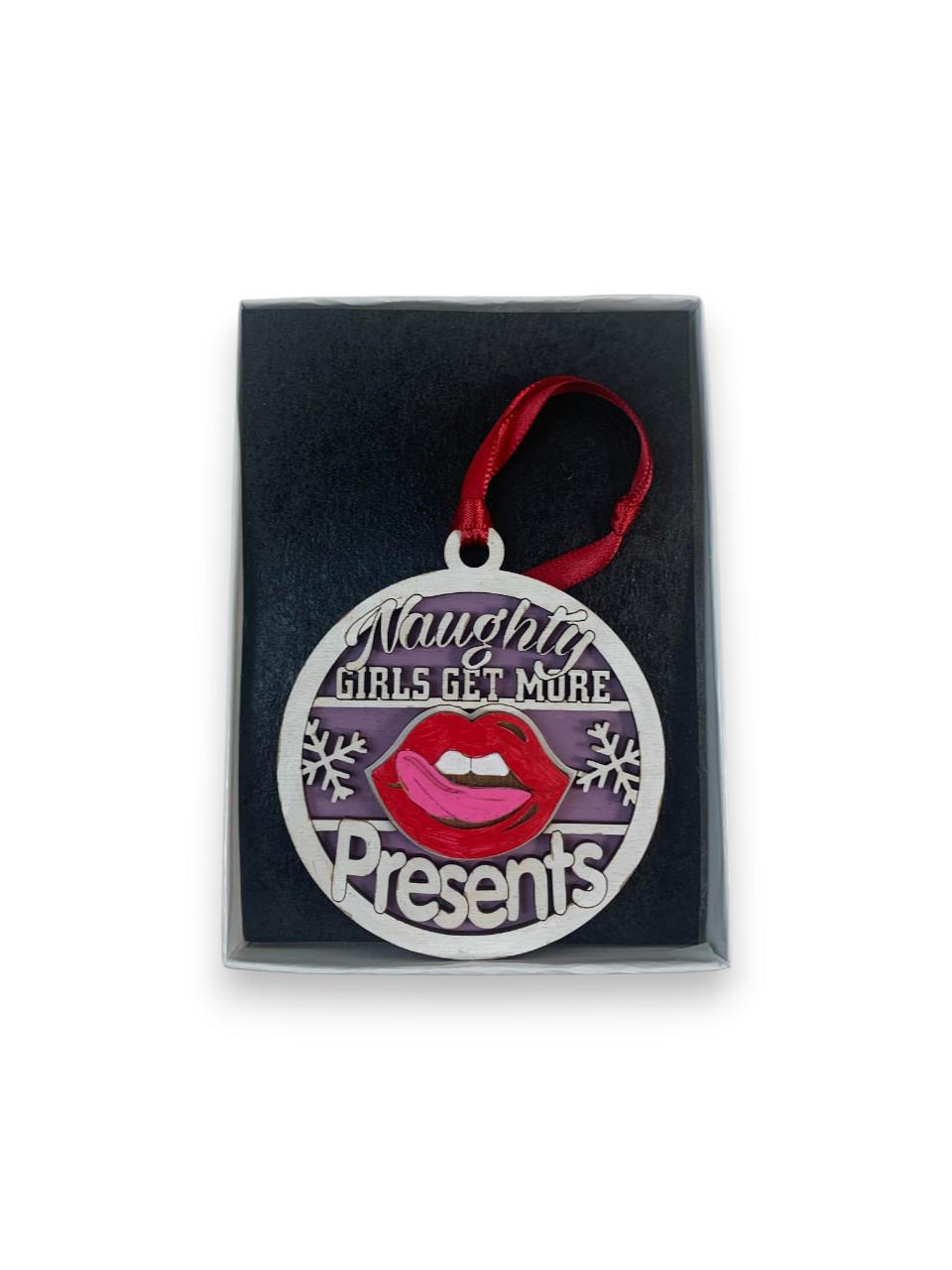 This Funny Naughty Girls Get More Presents Gag Gift Christmas ornament was laser engraved and cut from Birch wood. This was finished with acrylic paint and top coated with semi gloss Lacquer. A various color fabric ribbon was attached for ease of displaying this on your Christmas tree.