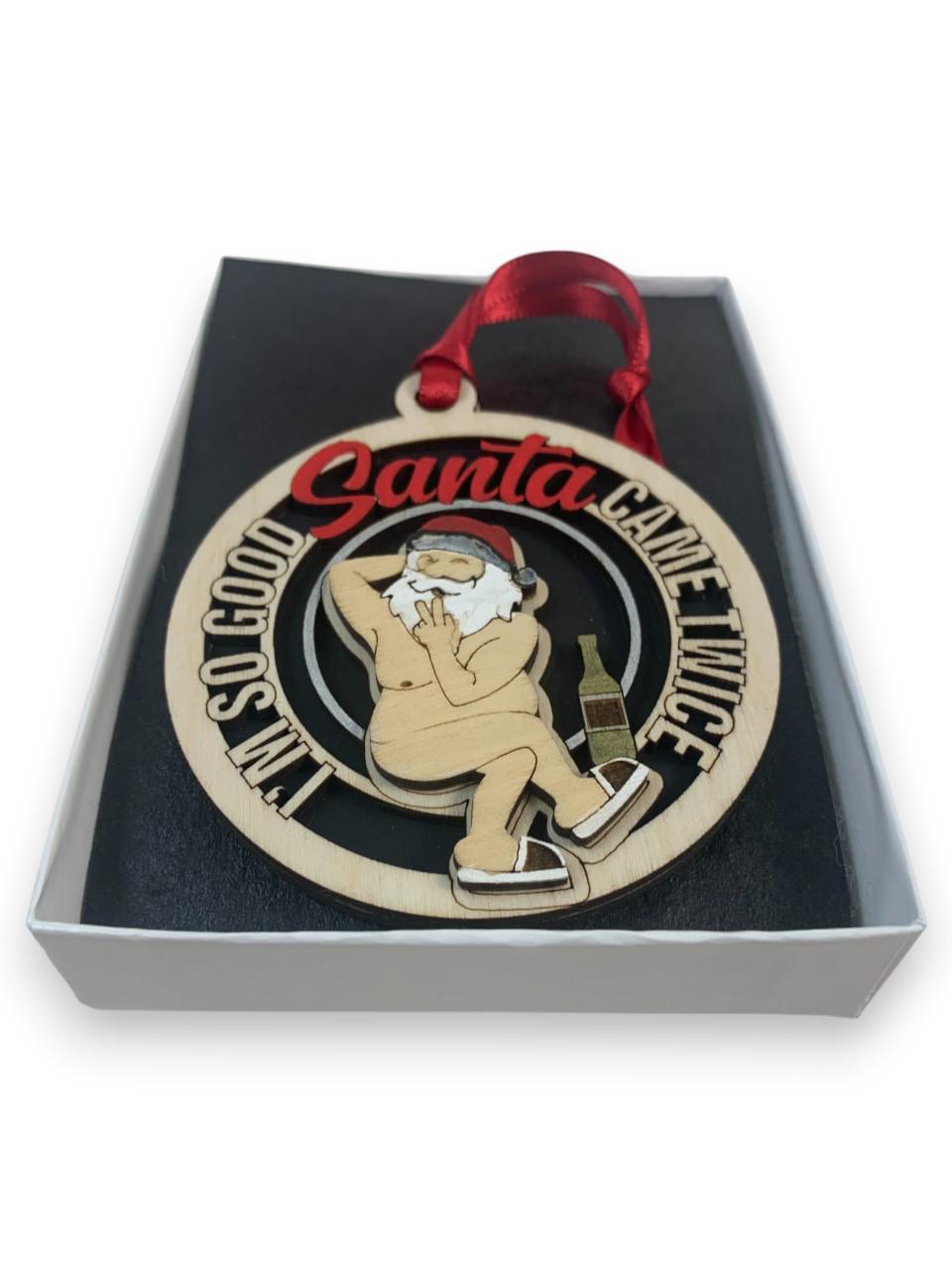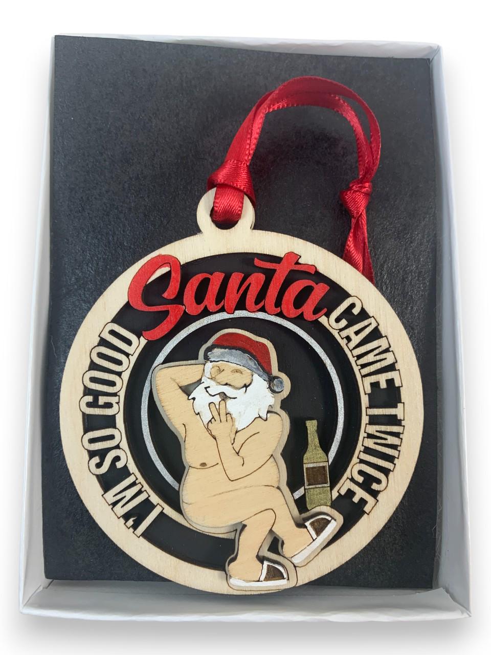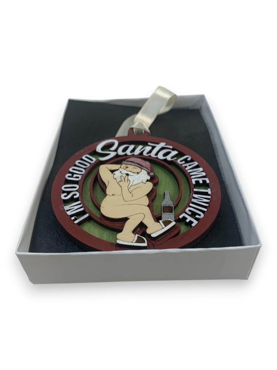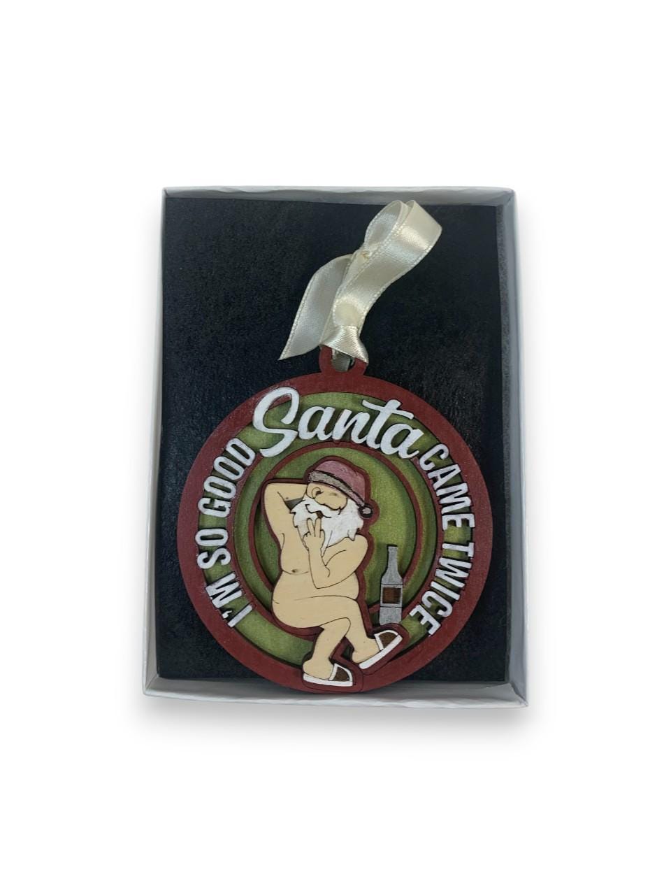 This Funny I'm So Good Santa Came Twice Ornament Gag Gift Christmas ornament was laser engraved and cut from Birch wood. This was finished with acrylic paint and top coated with semi gloss Lacquer. A various color fabric ribbon was attached for ease of displaying this on your Christmas tree.