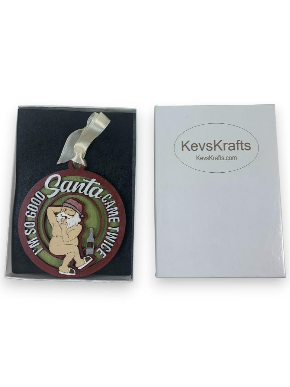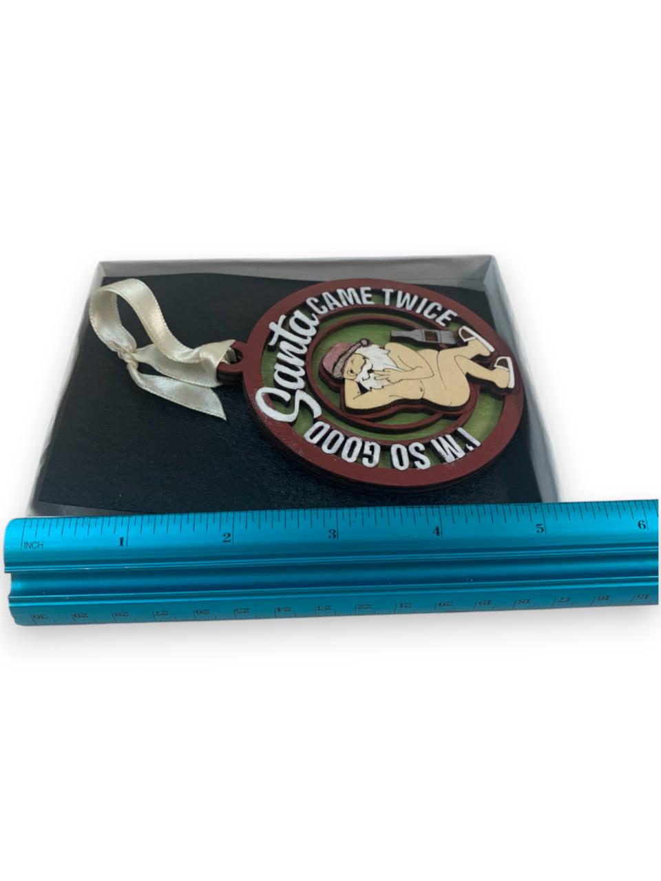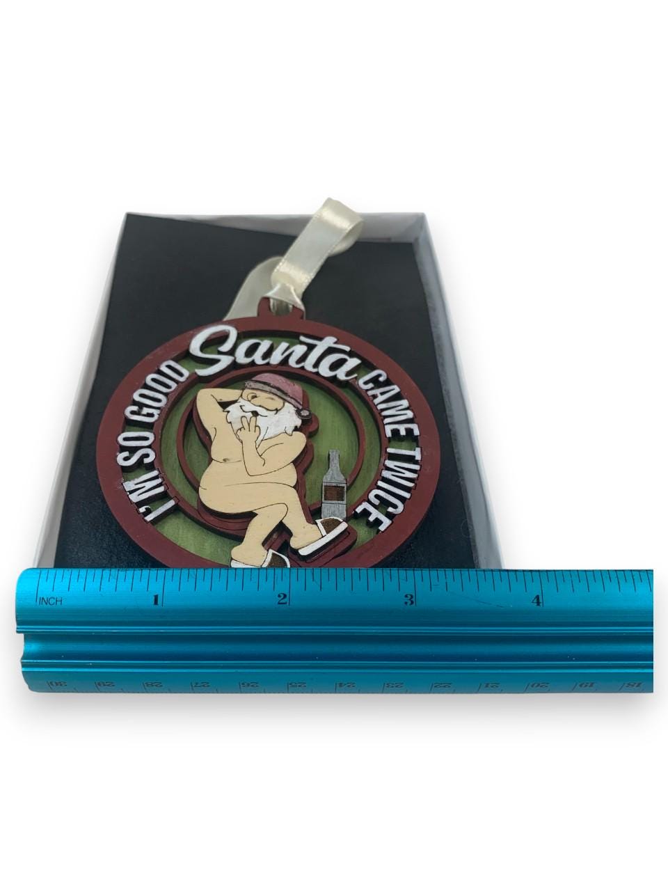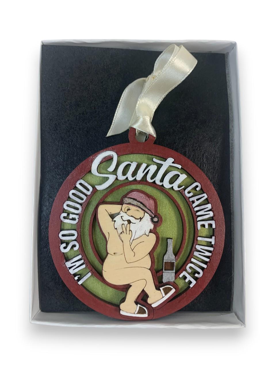 This Funny I'm So Good Santa Came Twice Ornament Gag Gift Christmas ornament was laser engraved and cut from Birch wood. This was finished with acrylic paint and top coated with semi gloss Lacquer. A various color fabric ribbon was attached for ease of displaying this on your Christmas tree.
