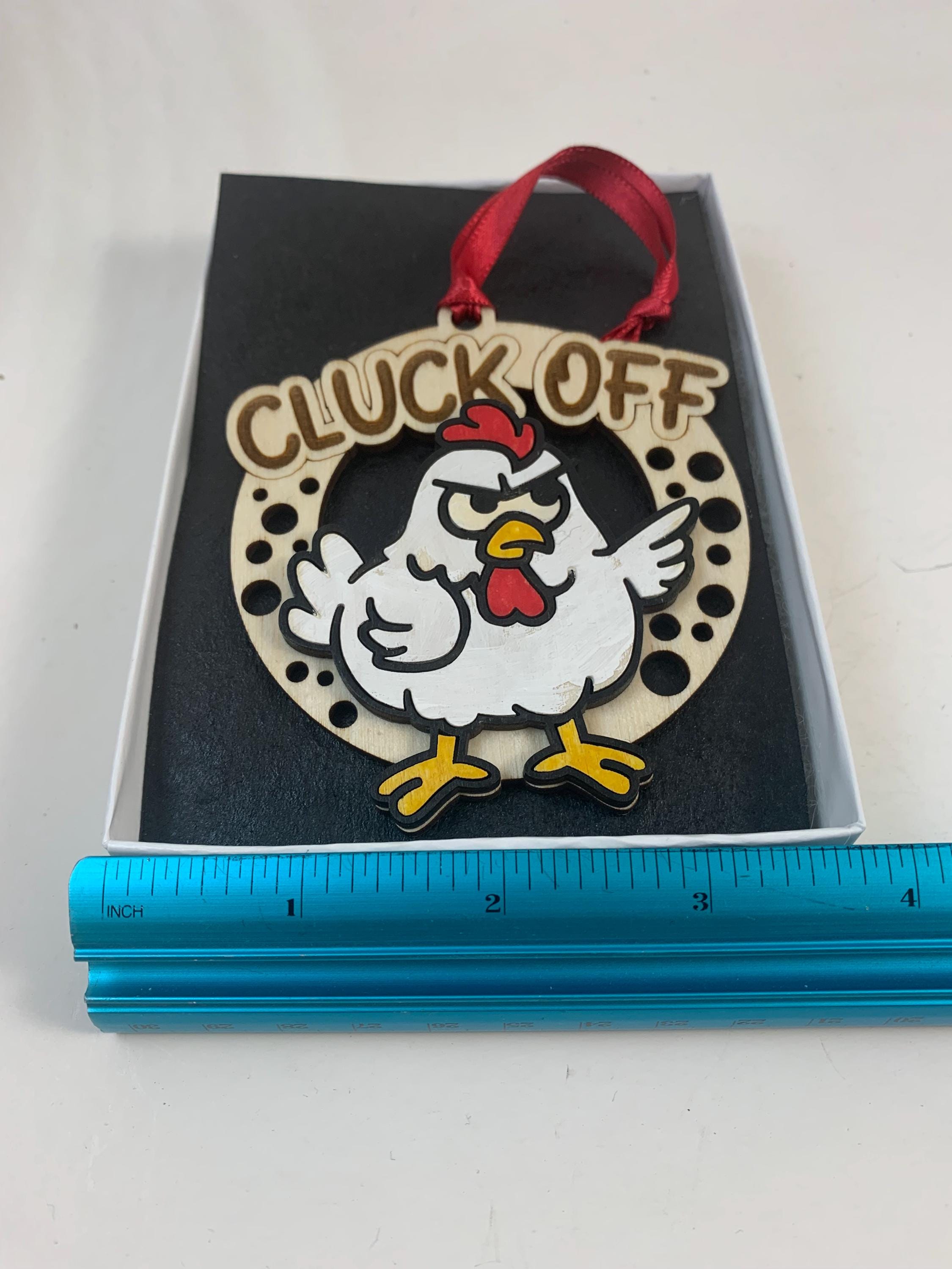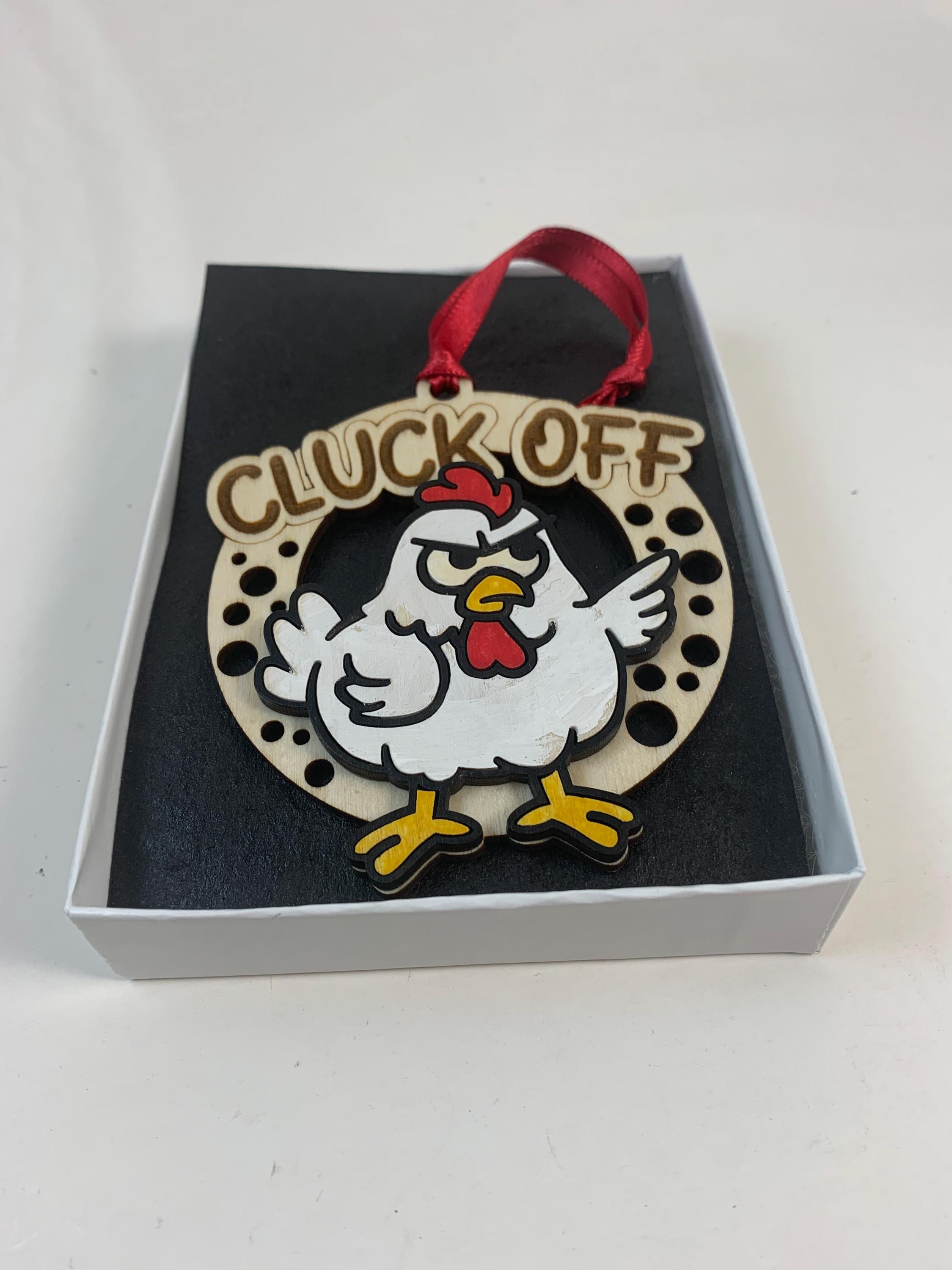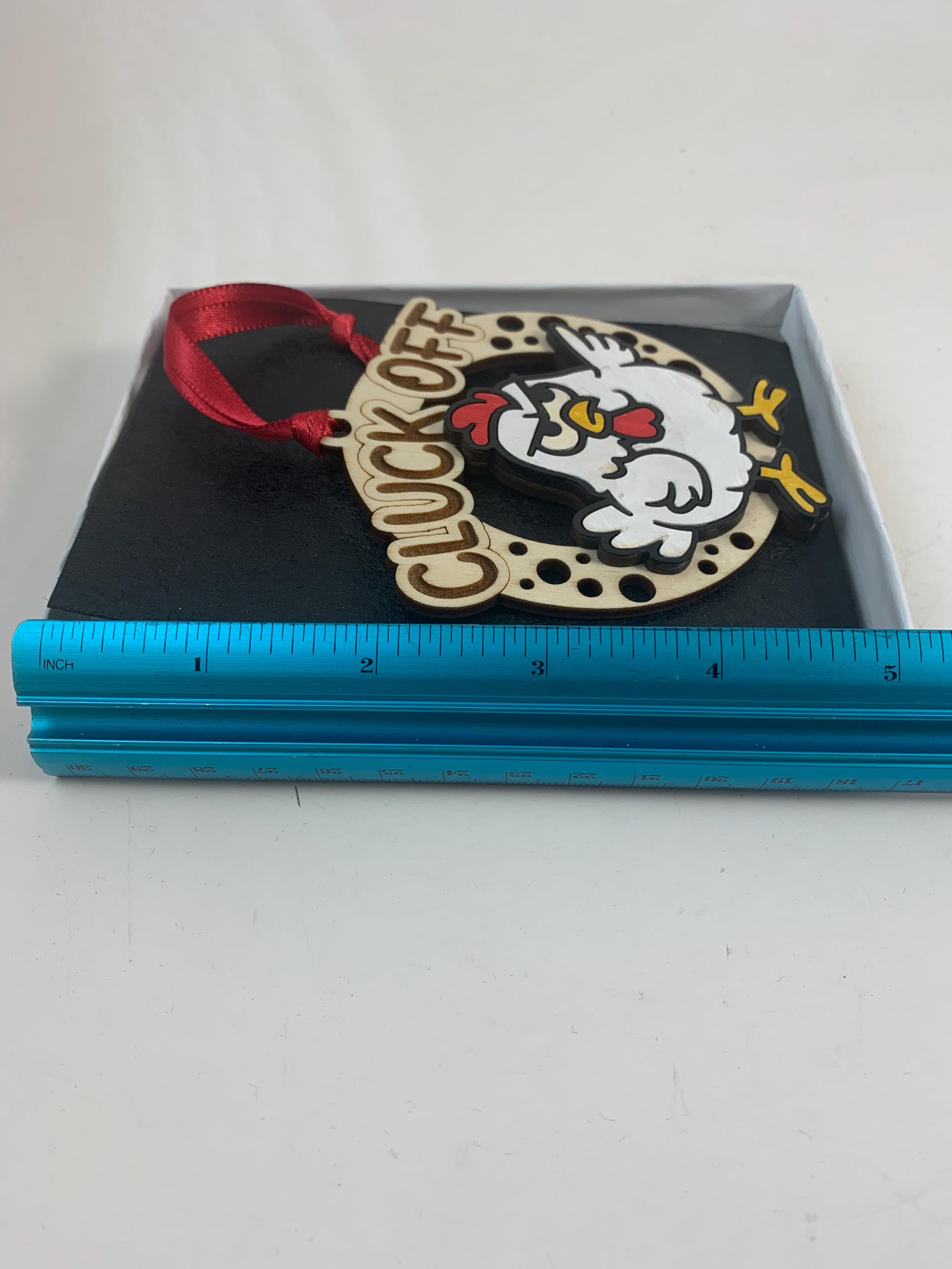 This Funny Chicken Gag Gift Christmas ornament "Cluck Off" was laser engraved and cut from Birch wood. This was finished with acrylic paint and top coated with semi gloss Lacquer. A various color fabric ribbon was attached for ease of displaying this on your Christmas tree.