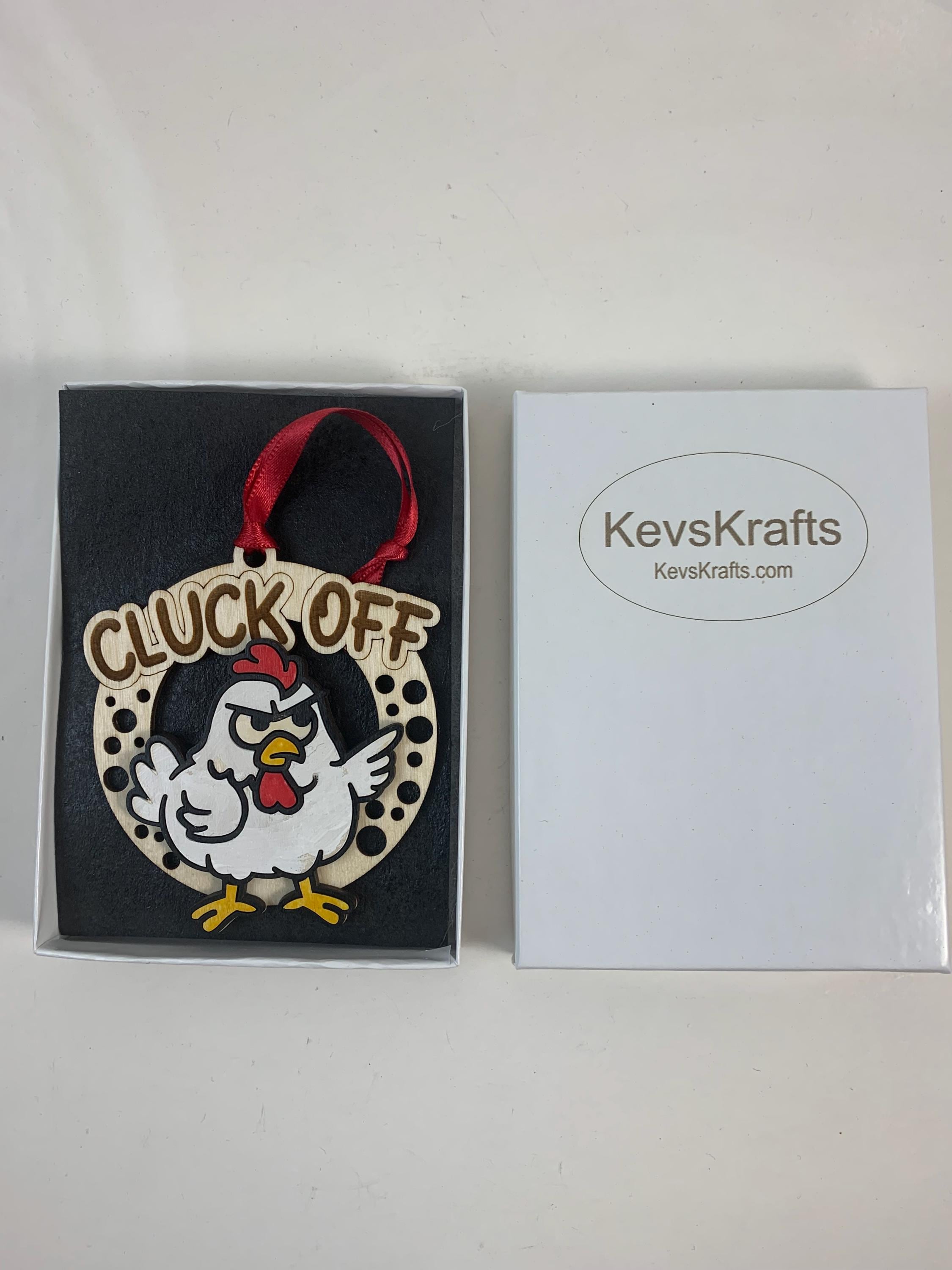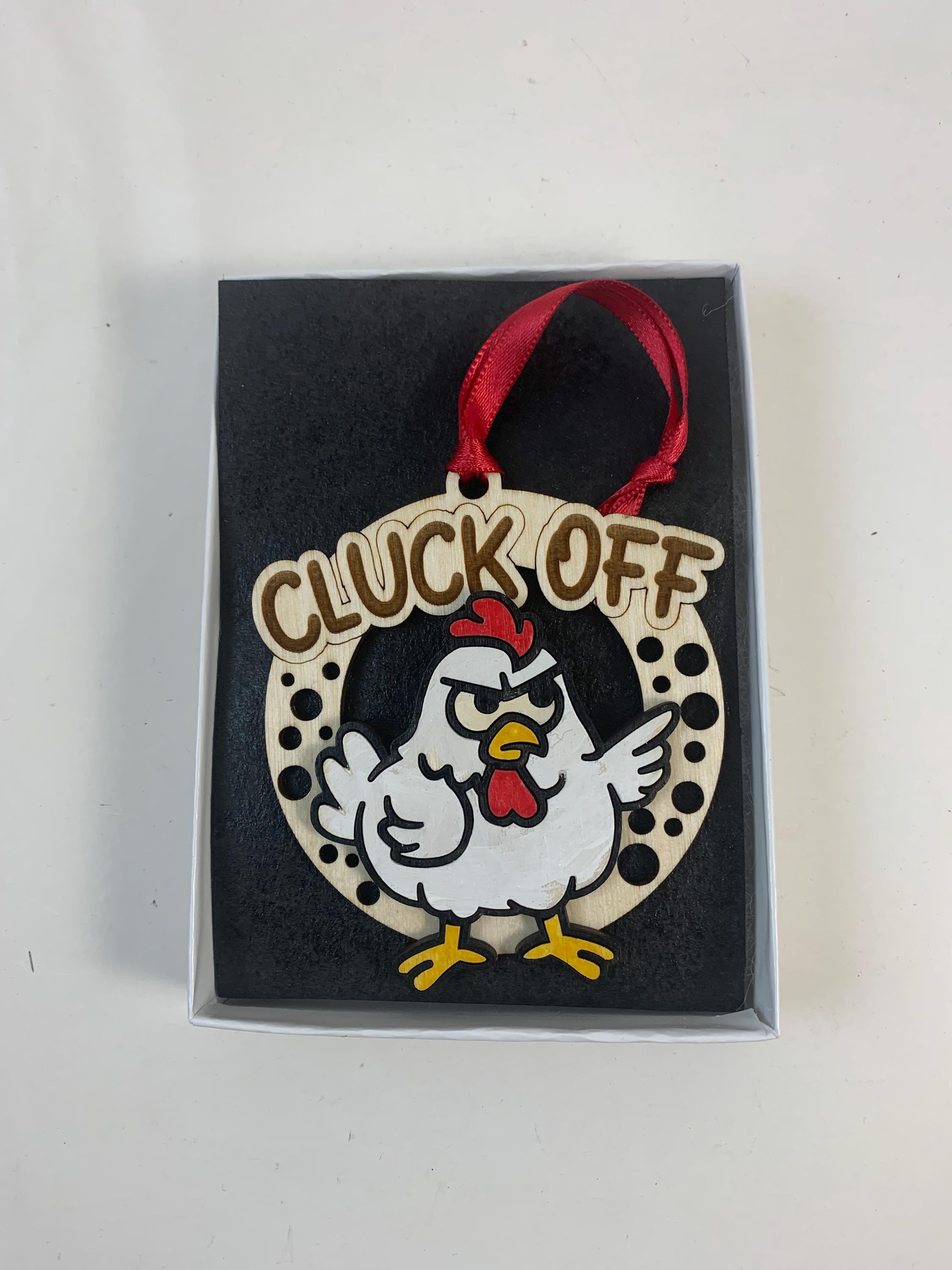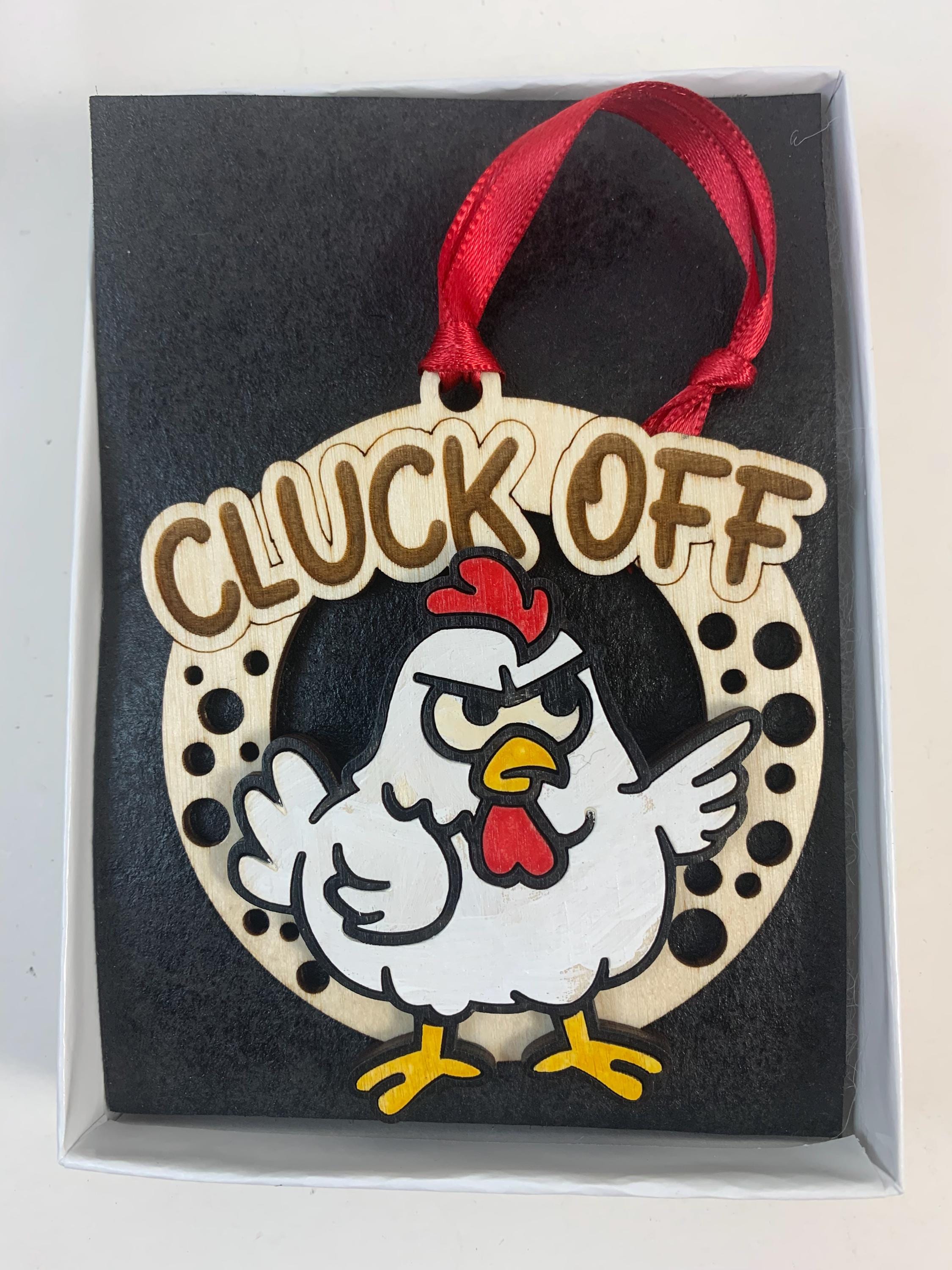 This Funny Chicken Gag Gift Christmas ornament "Cluck Off" was laser engraved and cut from Birch wood. This was finished with acrylic paint and top coated with semi gloss Lacquer. A various color fabric ribbon was attached for ease of displaying this on your Christmas tree.