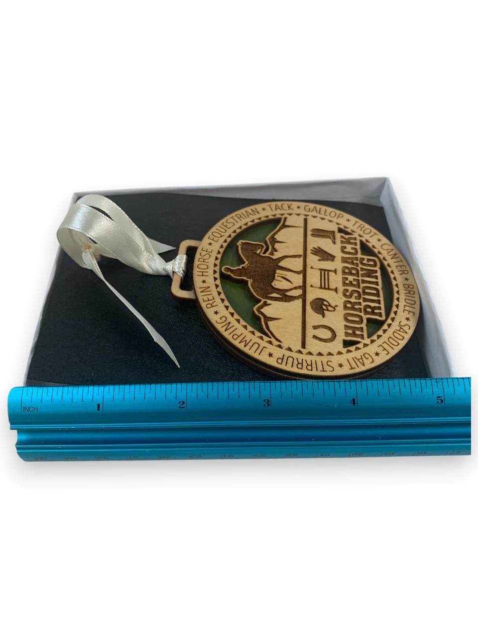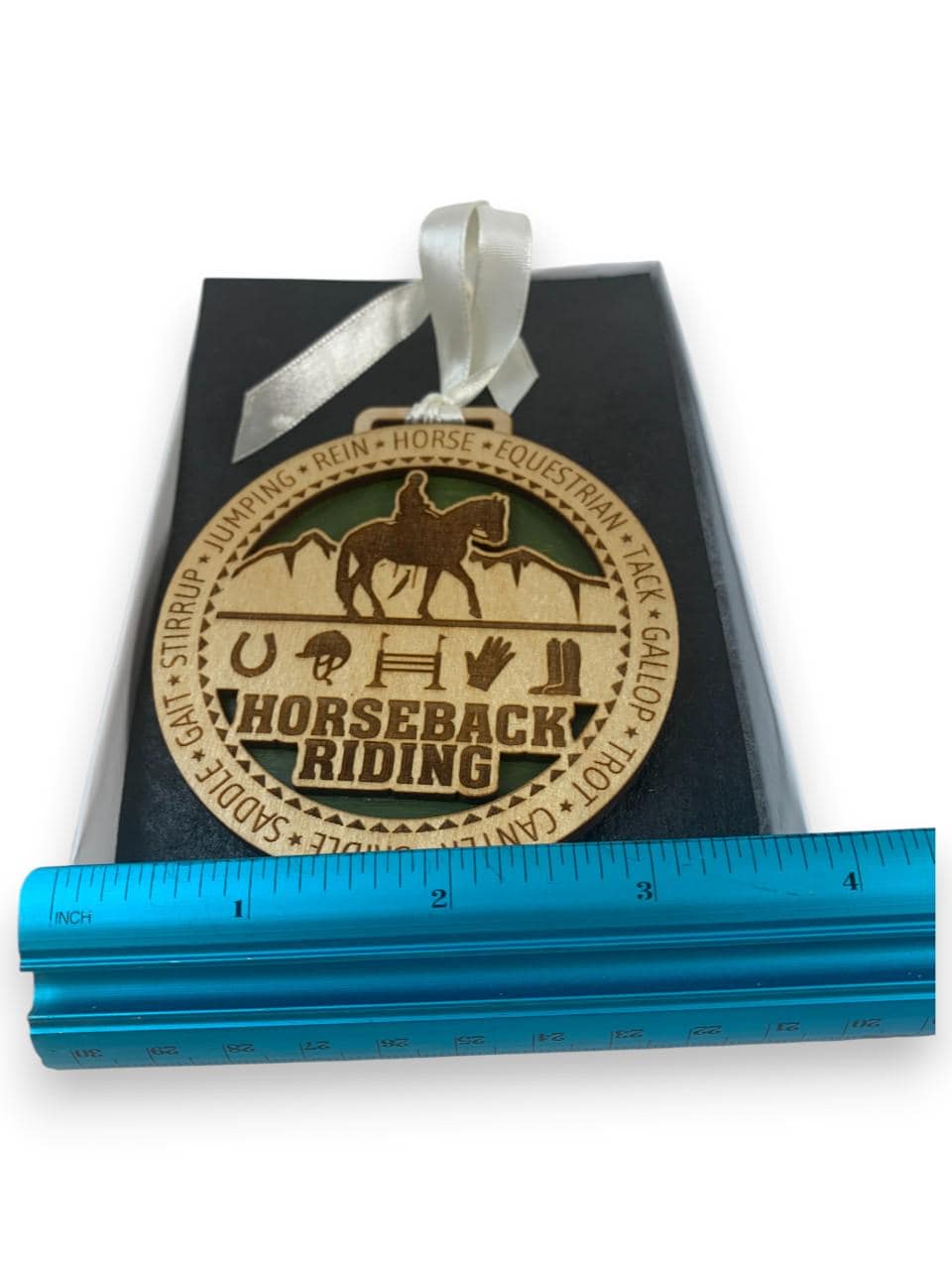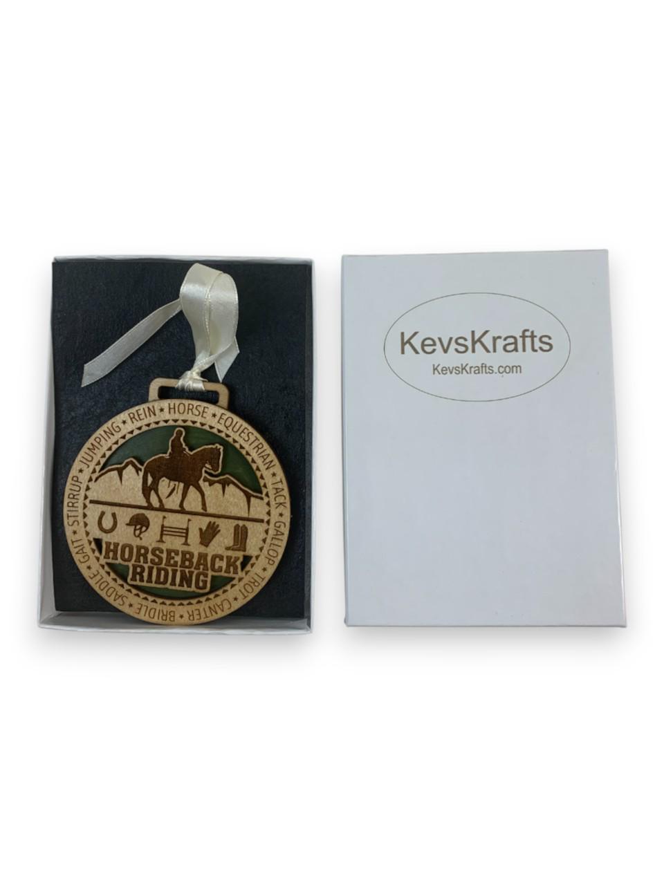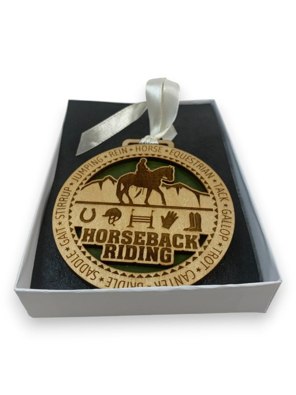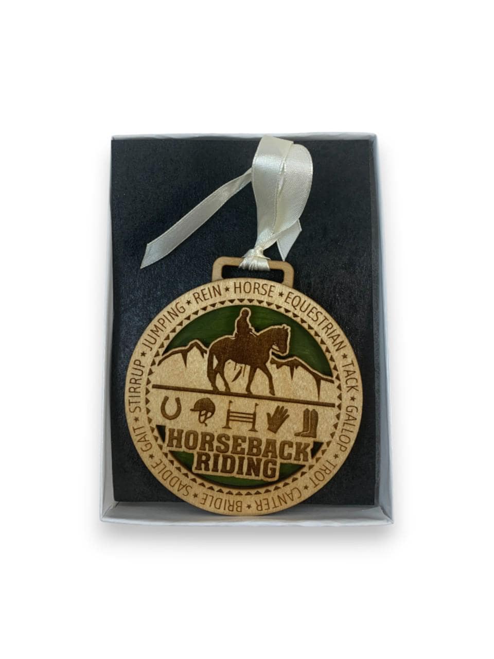 This beautifully crafted horseback riding wooden ornament is the perfect way to celebrate your passion for equestrian sports. Expertly laser-engraved with intricate details, this decorative piece features a silhouette of a horse and rider against a scenic backdrop, surrounded by equestrian-themed icons including a horseshoe, saddle, glove, and boot. The words "HORSEBACK RIDING" are prominently displayed, along with equestrian terminology like jumping, rein, horse, tack, gallop, trot, canter, bridle, saddle, gait, and stirrup encircling the design. The ornament showcases a lovely two-tone wood finish with a green accent background that makes the design pop. It comes complete with an elegant cream-colored satin ribbon for easy hanging on your Christmas tree or anywhere you want to display your love for horses. Presented in an attractive gift box, this ornament makes a thoughtful present for horse lovers, riders, trainers, or anyone who appreciates the beauty and grace of horseback riding. Whether commemorating a special achievement or simply celebrating the equestrian lifestyle, this charming wooden decoration will be treasured for years to come.